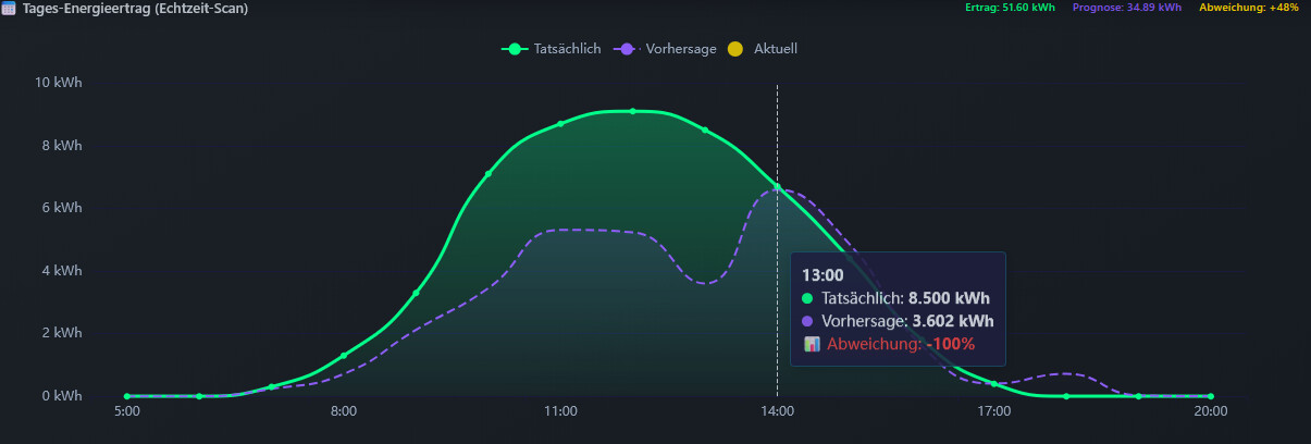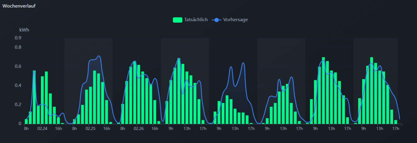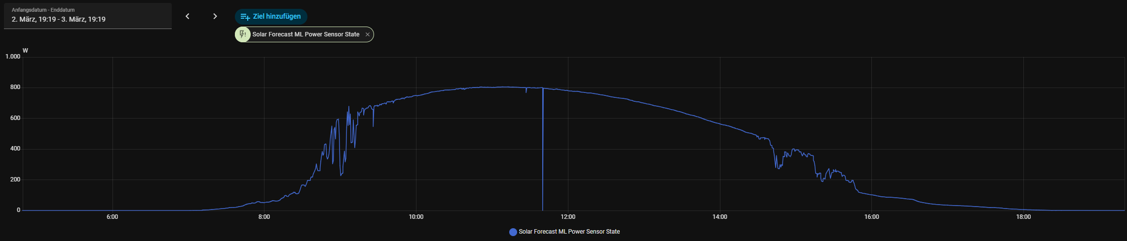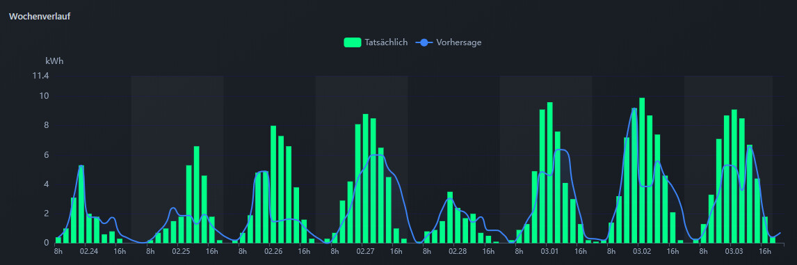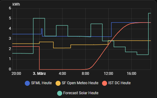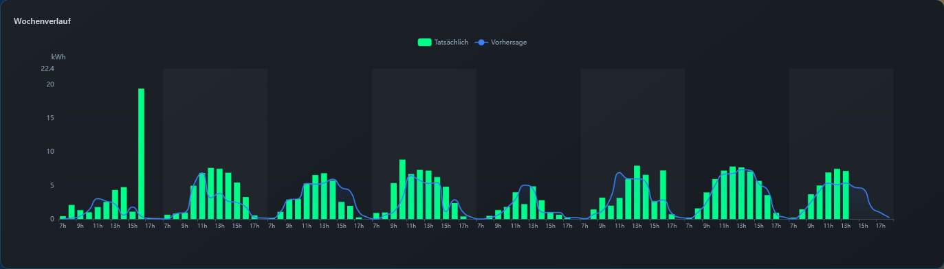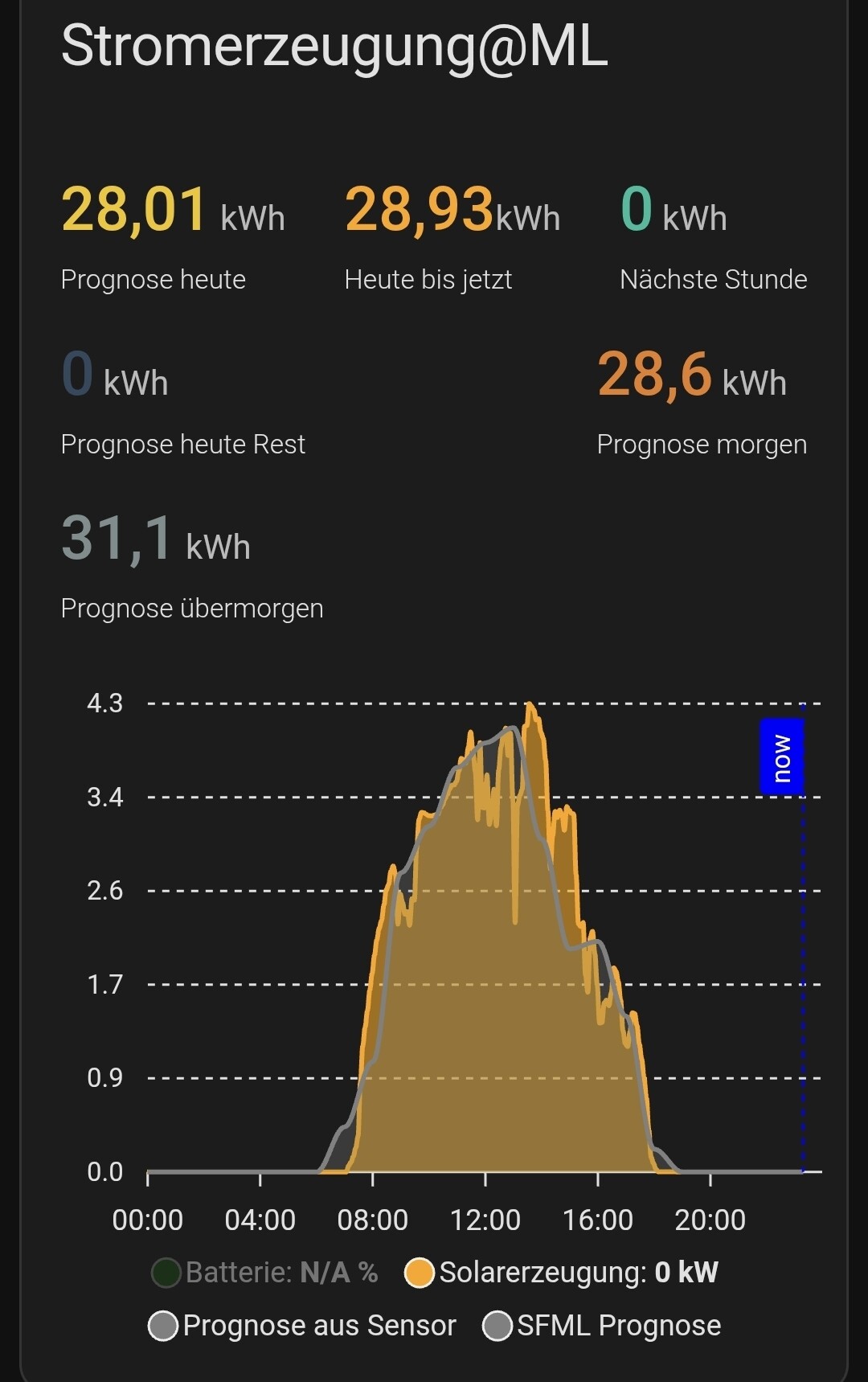 b. Zickte mein Tages-Gesamt-kWh Sensor über 2 Tage mit Wertesprüngen, auch kurz vor Mitternacht. Das war offensichtlich der bei mir nach wie vor wackeligen Sunspec Integration geschuldet. Aber das Problem sollte ich nun über entsprechende Sensor-Templates abgefangen/gefixt haben. Ich beobachte erstmal weiter, bevor ich ggf. nochmal komplett neu starte. Keine Ahnung, wie lange ggf. leicht kontaminierte historische Daten/Sensorwerte sich auf die aktuellen Prognosen auswirken…?