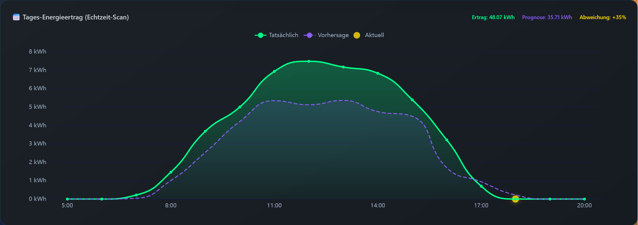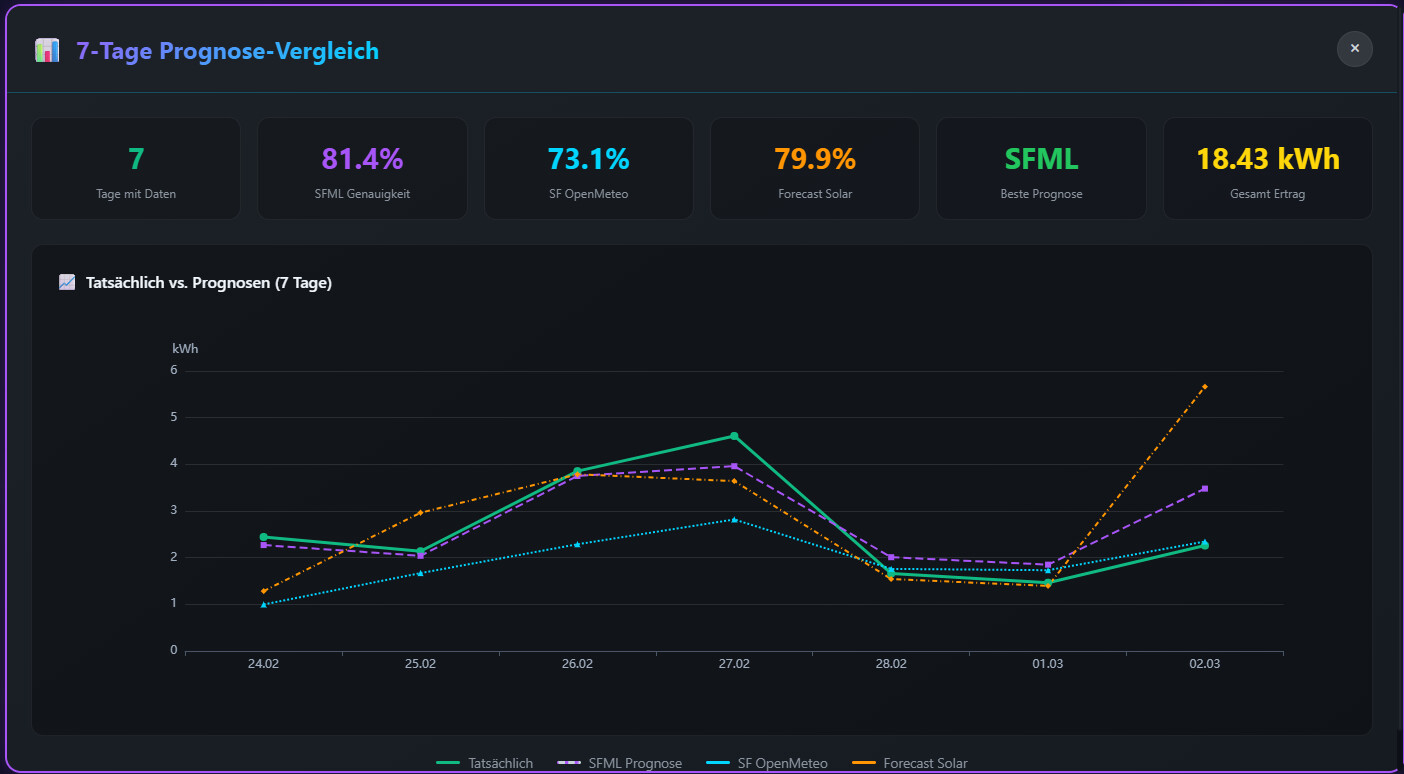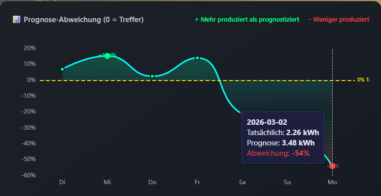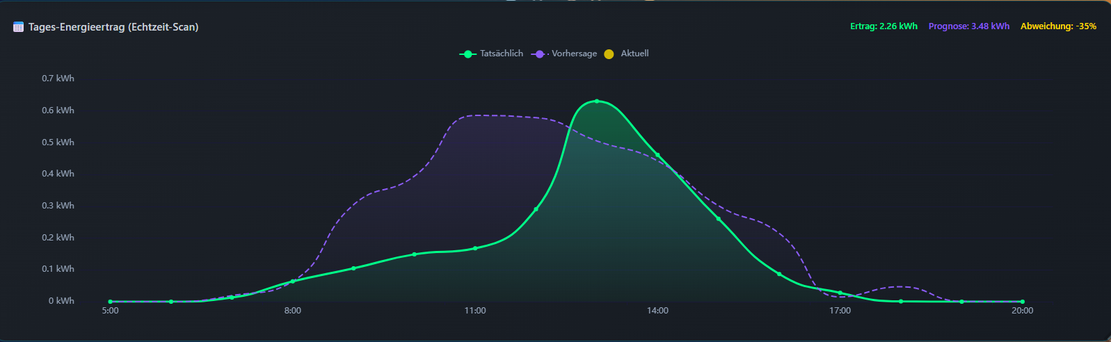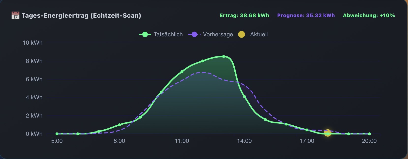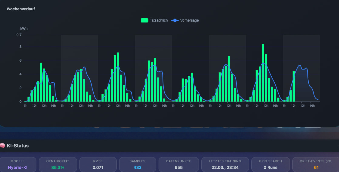 b. Zickte mein Tages-Gesamt-kWh Sensor über 2 Tage mit Wertesprüngen, auch kurz vor Mitternacht. Das war offensichtlich der bei mir nach wie vor wackeligen Sunspec Integration geschuldet. Aber das Problem sollte ich nun über entsprechende Sensor-Templates abgefangen/gefixt haben. Ich beobachte erstmal weiter, bevor ich ggf. nochmal komplett neu starte. Keine Ahnung, wie lange ggf. leicht kontaminierte historische Daten/Sensorwerte sich auf die aktuellen Prognosen auswirken…?