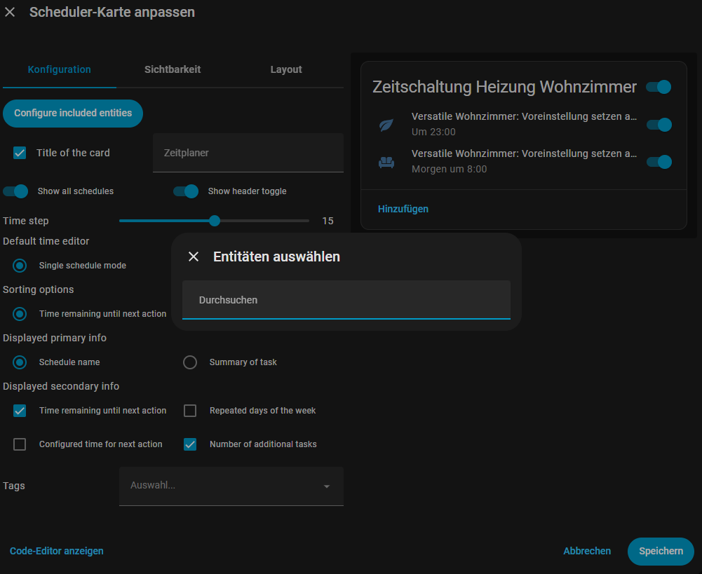 Mein Problem: In der Scheduler Card wird mir nur der Thermostat für das Wohnzimmer angezeigt, nicht aber der neue für die Küche.