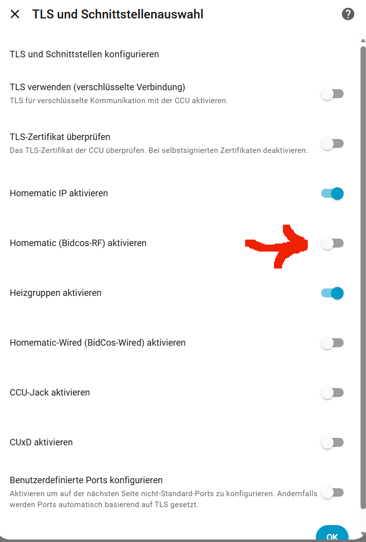 Wenn Du Homematic Geräte (ohne IP) verwendest, muss die entsprechende Schnittstelle in der Konfiguration von Homematic(IP) Local for OpenCCU aktiviert sein:
