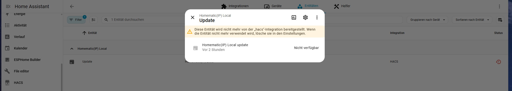 Neustart hat nicht geholfen. Ich habe übrigens OpenCCU lokal auf Home Assistant laufen. Ich habe da nach Updates geschaut und auch für die Kommunikationsschnittstelle über HACS das “Homematic(IP) Local for OpenCCU”, aber irgendwie war das gar nicht mehr installiert. Also wieder installiert und siehe da, Problem behoben ![]()