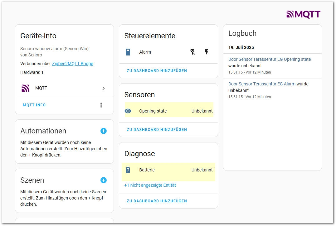 Das Gerät wird von MQTT erkannt nur leider ist sowohl Opening State als auch Batterie Status “unbekannt”…