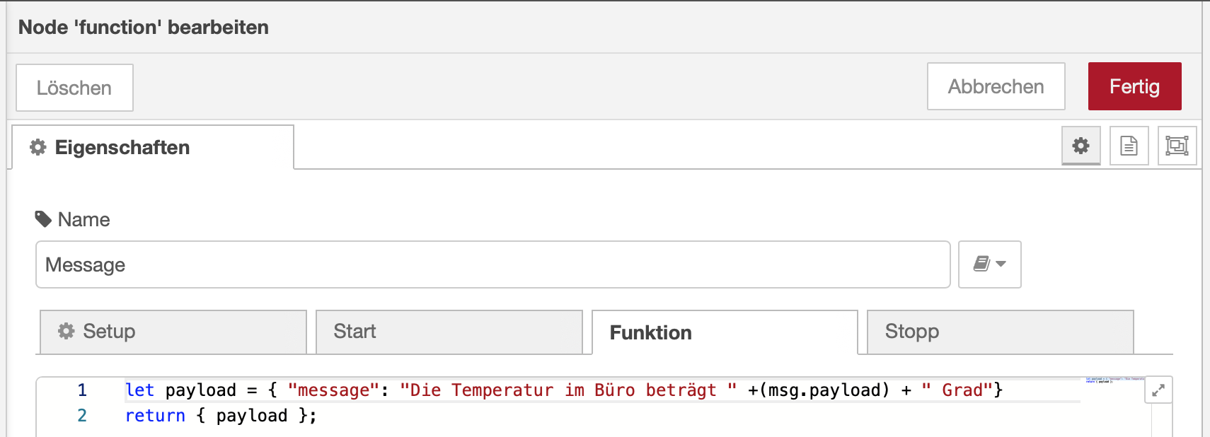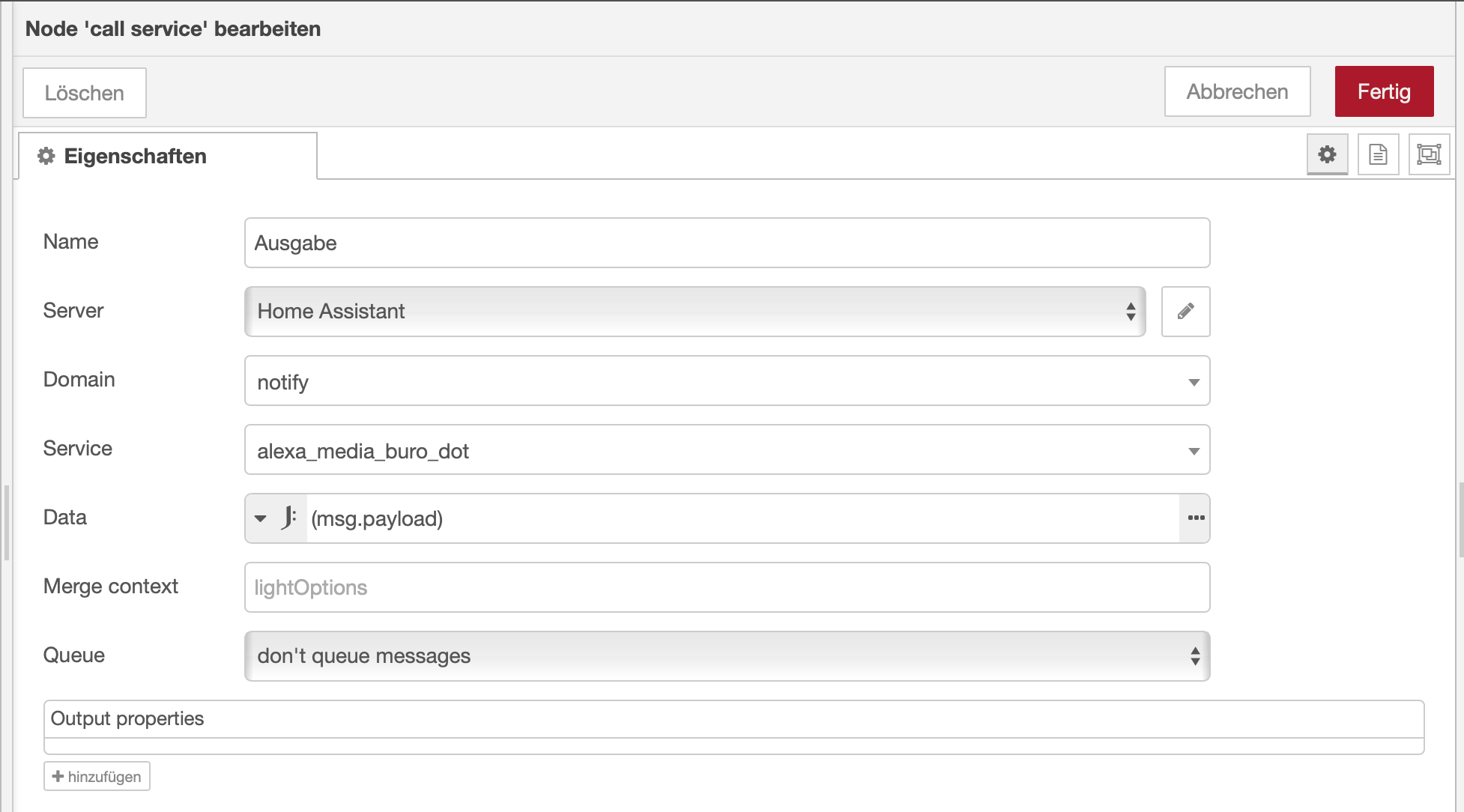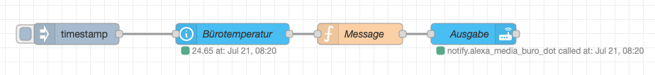 [{"id":"2776d3a90674c078","type":"tab","label":"Flow 1","disabled":false,"info":"","env":[]},{"id":"2da8a6ad1cf26b8c","type":"inject","z":"2776d3a90674c078","name":"","props":[{"p":"payload"},{"p":"topic","vt":"str"}],"repeat":"","crontab":"","once":false,"onceDelay":0.1,"topic":"","payload":"","payloadType":"date","x":420,"y":160,"wires":[["e26e1eb4ca293525"]]},{"id":"e26e1eb4ca293525","type":"api-current-state","z":"2776d3a90674c078","name":"Bürotemperatur","server":"a1aba8eb.bfd618","version":3,"outputs":1,"halt_if":"","halt_if_type":"num","halt_if_compare":"is","entity_id":"sensor.buro_temperature","state_type":"num","blockInputOverrides":false,"outputProperties":[{"property":"payload","propertyType":"msg","value":"","valueType":"entityState"},{"property":"data","propertyType":"msg","value":"","valueType":"entity"}],"for":"0","forType":"num","forUnits":"minutes","override_topic":false,"state_location":"payload","override_payload":"msg","entity_location":"data","override_data":"msg","x":640,"y":160,"wires":[["870121a322a111ea"]]},{"id":"97b4e21b4cdcc67e","type":"api-call-service","z":"2776d3a90674c078","name":"Ausgabe","server":"a1aba8eb.bfd618","version":5,"debugenabled":true,"domain":"notify","service":"alexa_media_buro_dot","areaId":[],"deviceId":[],"entityId":[],"data":"(msg.payload)","dataType":"jsonata","mergeContext":"","mustacheAltTags":false,"outputProperties":[],"queue":"none","x":980,"y":160,"wires":[[]]},{"id":"870121a322a111ea","type":"function","z":"2776d3a90674c078","name":"Message","func":"let payload = { \"message\": \"Die Temperatur im Büro beträgt \" +(msg.payload) + \" Grad\"}\nreturn { payload };","outputs":1,"noerr":0,"initialize":"","finalize":"","libs":[],"x":820,"y":160,"wires":[["97b4e21b4cdcc67e"]]},{"id":"a1aba8eb.bfd618","type":"server","name":"Home Assistant","version":5,"addon":true,"rejectUnauthorizedCerts":true,"ha_boolean":"y|yes|true|on|home|open","connectionDelay":true,"cacheJson":true,"heartbeat":false,"heartbeatInterval":30,"areaSelector":"friendlyName","deviceSelector":"friendlyName","entitySelector":"friendlyName","statusSeparator":"at: ","statusYear":"hidden","statusMonth":"short","statusDay":"numeric","statusHourCycle":"h23","statusTimeFormat":"h:m","enableGlobalContextStore":true}]