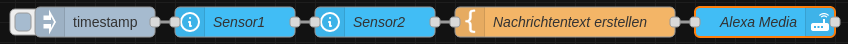 [{"id":"2da8a6ad1cf26b8c","type":"inject","z":"2776d3a90674c078","name":"","props":[{"p":"payload"},{"p":"topic","vt":"str"}],"repeat":"","crontab":"","once":false,"onceDelay":0.1,"topic":"","payload":"","payloadType":"date","x":120,"y":200,"wires":[["e26e1eb4ca293525"]]},{"id":"e26e1eb4ca293525","type":"api-current-state","z":"2776d3a90674c078","name":"Sensor1","server":"","version":3,"outputs":1,"halt_if":"","halt_if_type":"num","halt_if_compare":"is","entity_id":"sensor.DEIN_SENSOR1","state_type":"num","blockInputOverrides":false,"outputProperties":[{"property":"sensor1","propertyType":"msg","value":"","valueType":"entity"},{"property":"payload","propertyType":"msg","value":"{}","valueType":"jsonata"}],"for":"0","forType":"num","forUnits":"minutes","override_topic":false,"state_location":"payload","override_payload":"msg","entity_location":"data","override_data":"msg","x":260,"y":200,"wires":[["ca1535d1c034bf55"]]},{"id":"ca1535d1c034bf55","type":"api-current-state","z":"2776d3a90674c078","name":"Sensor2","server":"","version":3,"outputs":1,"halt_if":"","halt_if_type":"num","halt_if_compare":"is","entity_id":"sensor.multisensor_keller_temperatur","state_type":"num","blockInputOverrides":false,"outputProperties":[{"property":"sensor2","propertyType":"msg","value":"","valueType":"entity"}],"for":"0","forType":"num","forUnits":"minutes","override_topic":false,"state_location":"payload","override_payload":"msg","entity_location":"data","override_data":"msg","x":400,"y":200,"wires":[["b6fb08e4cc70805f"]]},{"id":"b6fb08e4cc70805f","type":"template","z":"2776d3a90674c078","name":"Nachrichtentext erstellen","field":"data.message","fieldType":"msg","format":"handlebars","syntax":"mustache","template":"Die Temperatur von Sensor1 beträgt {{sensor1.state}} Grad und Sensor2 misst {{ sensor2.state}} Grad!","output":"str","x":590,"y":200,"wires":[["6ea456566e18de39"]]},{"id":"6ea456566e18de39","type":"api-call-service","z":"2776d3a90674c078","name":"Alexa Media ","server":"","version":5,"debugenabled":true,"domain":"notify","service":"alexa_media_DEINE_ALEXA","areaId":[],"deviceId":[],"entityId":[],"data":"{ \"message\": data.message}","dataType":"jsonata","mergeContext":"","mustacheAltTags":false,"outputProperties":[],"queue":"none","x":790,"y":200,"wires":[[]]}]