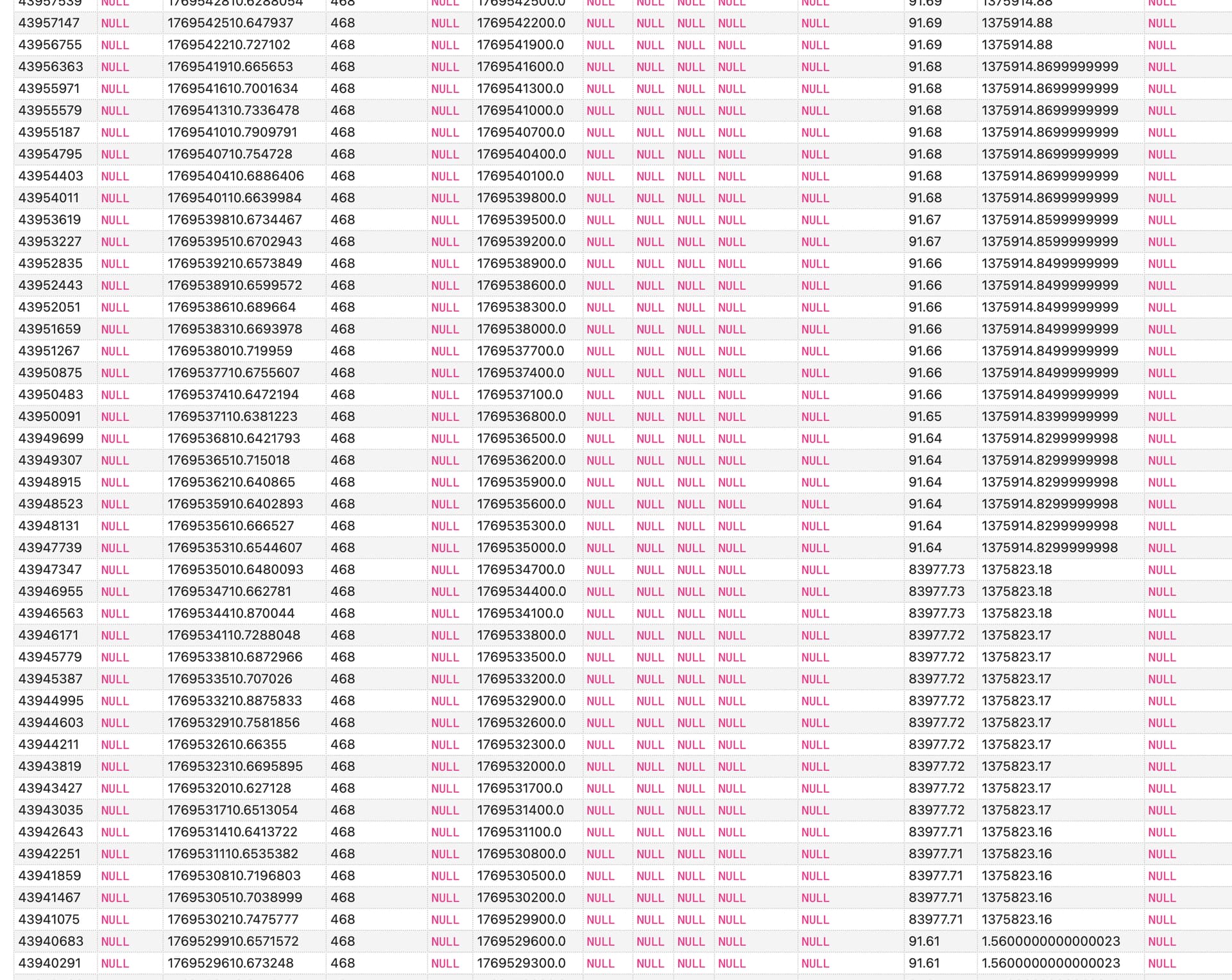 Ich mein, dass sind so kleine Wertänderungen seitdem. Wenn ich nun alle Ausreiser-Werte bei “state” und “sum” auf die Werte aus dem letzten korrekten Datensatz setze, wäre das auch okay. Den mit der ID 43940683 (der vorletzte im Screenshot)