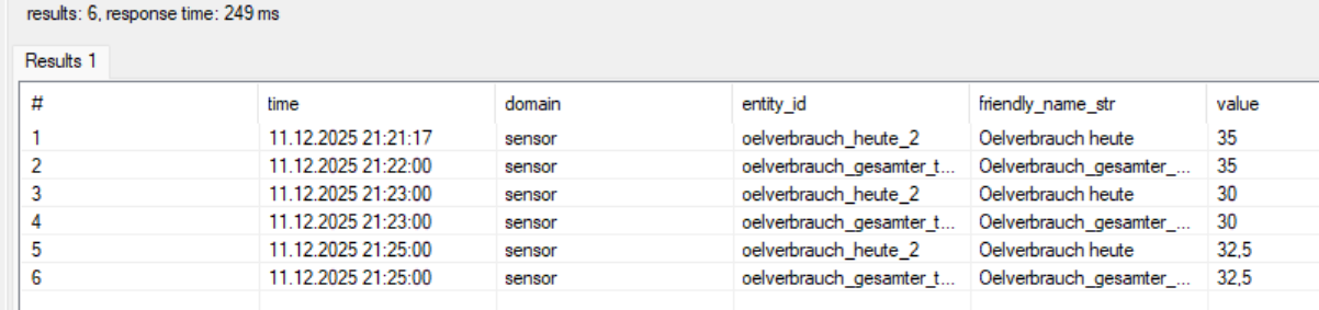 Problem ist, dass bei beide Werte nicht in die InfluxDB geschrieben werden. Die Entitäten werden zwar angelegt, aber eben keine Werte geschrieben. (Die Stromzähler werden geschrieben, Zugriff von HA auf die DB funktioniert also.