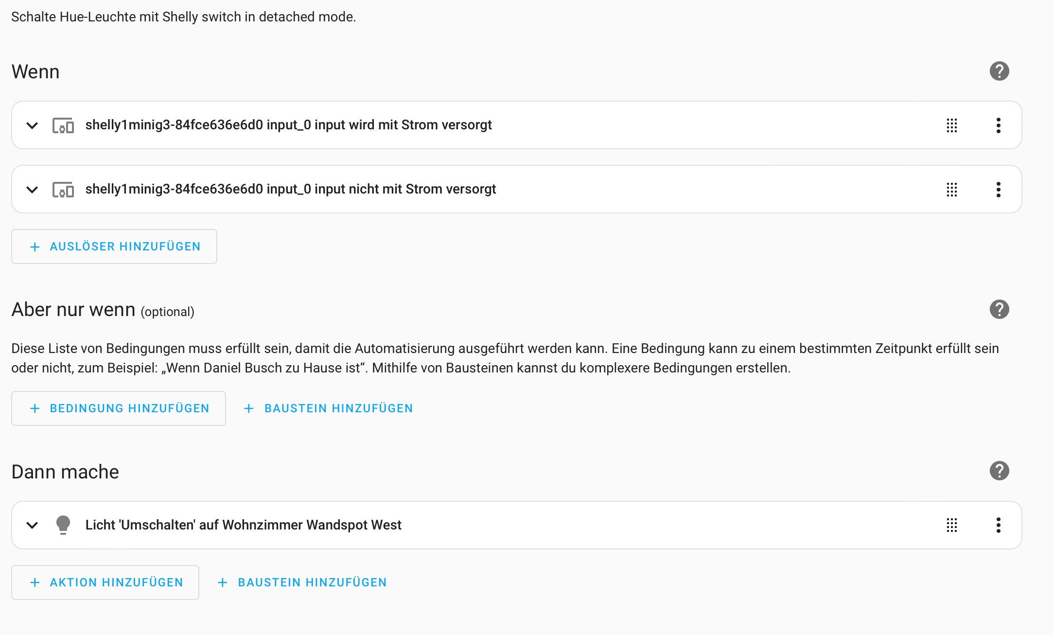 Nur die Abfrage „on“ passt m.M.n nicht, da Du ja die Lampe auch über den Schalter schaltest, so dassves sein kann, das der Input auf „on“ steht und die Lampe an ist, denn Du hast ja den Ausgang vom Input entkoppelt und schaltest die Lampe ja über die Hue-Bridge, oder?