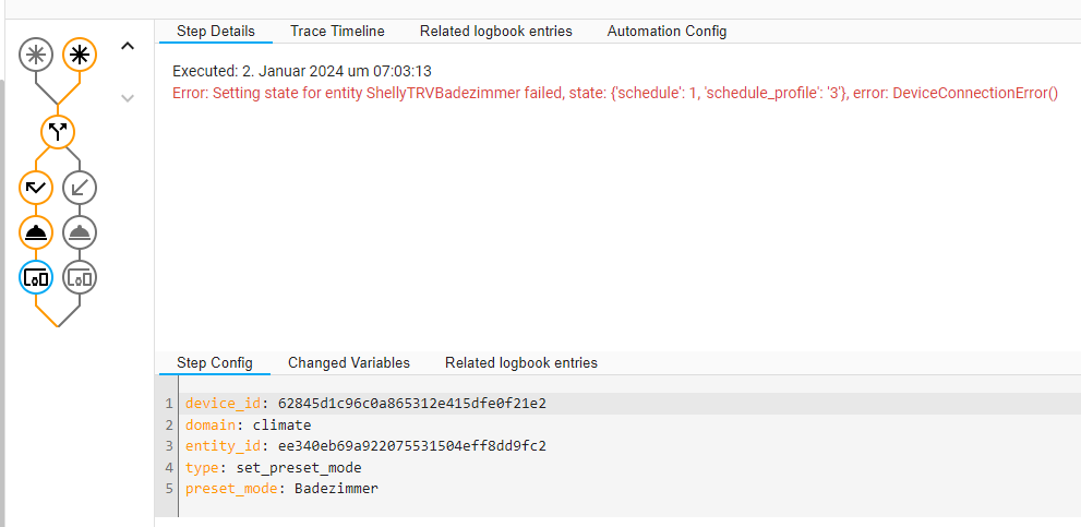 in unregelmäßigen Abständen schaltet mein Shelly TRV (egal in welchem Raum) nicht in den gewünschten “set_preset_mode”. Beispiel Badezimmer: Ich möchte, wenn das Fenster geöffnet wird den “set_preset_mode” auf “BadezimmerAus” bzw. wenn das Fenster geschlossen wird “Badezimmer” einstellen.
