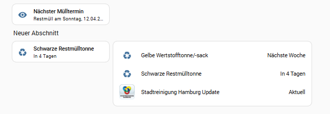 Moin, ich habe die aktuelle Version vom Strategy Dashbord installiert, leider habe ich auch nach vielem testen immer noch das Problem, das mir von Favoriten die falschen Werte angezeigt werden. Aktuell handelt es sich um die Müllabfuhr. Dort sehe ich nur den Wert der letzten Aktualisierung, aber leider nicht den Wert, wann die Abfuhr erfolgt. Wenn ich mir das in einer normalen Karten anzeigen lasse, passt der Wert.