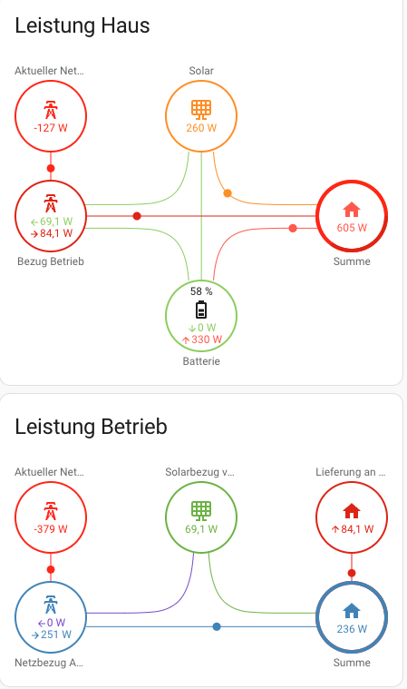 Nach der Installation sind die wichtigen Entitäten “pconsume” für den Bezug aus dem Netz und “psupply” für die Einspeisung ins Netz - Zum Auslesen der Wechselrichter habe ich dann die Integration Sunspec über HACS installiert Sunspec. Hier die Wechselrichter nacheinander installieren. Hierzu die IP des Wechselrichters (feste IP im Router vergeben) , den Modbus port: 502 und Slave ID: 126. Nach der Installation (und Neustart) sind pro Wechselrichter zahlreiche Entitäten zu finden. Für den Wechselrichter sind bei mir inverter_watthours und inverter_watts und bei Batteriewechselrichter *batterie_inverter_watts der je nach “laden” oder “entladen” negative und positive Werte ausgibt sowie *batterie_storage_chastate der den Batteristatus in % anzeigt. Grundsätzlich sind dann alle Werte zunächst verfügbar.