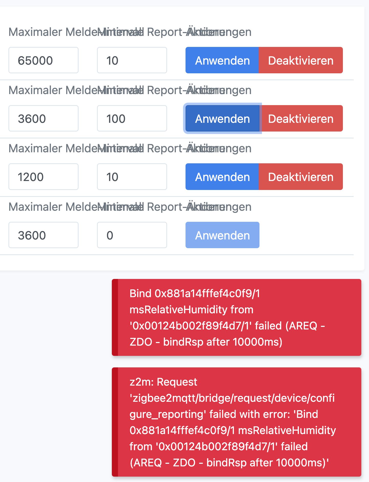 Ich wollte die minimalen, maximalen Meldeintervalle sowie Reportänderungen von einem meiner SNZB-02D in Zigbee2MQTT > Berichte anpassen und erhalte folgende Meldungen: