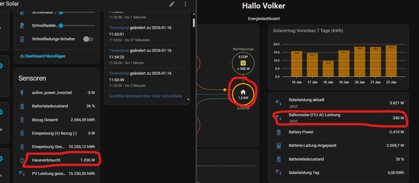 Ich habe eine Solaranlage auf dem Dach (alles funktionierte 1a). Jetzt habe ich noch ein Balkonkraftwerk installiert und mir ist aufgefallen nachdem ich das Balkonkraftwerk im Energie-Board konfiguriert habe das der Hausverbrauch ziemlich genau um den Balkonkraftwerk Ertrag zu hoch ist.