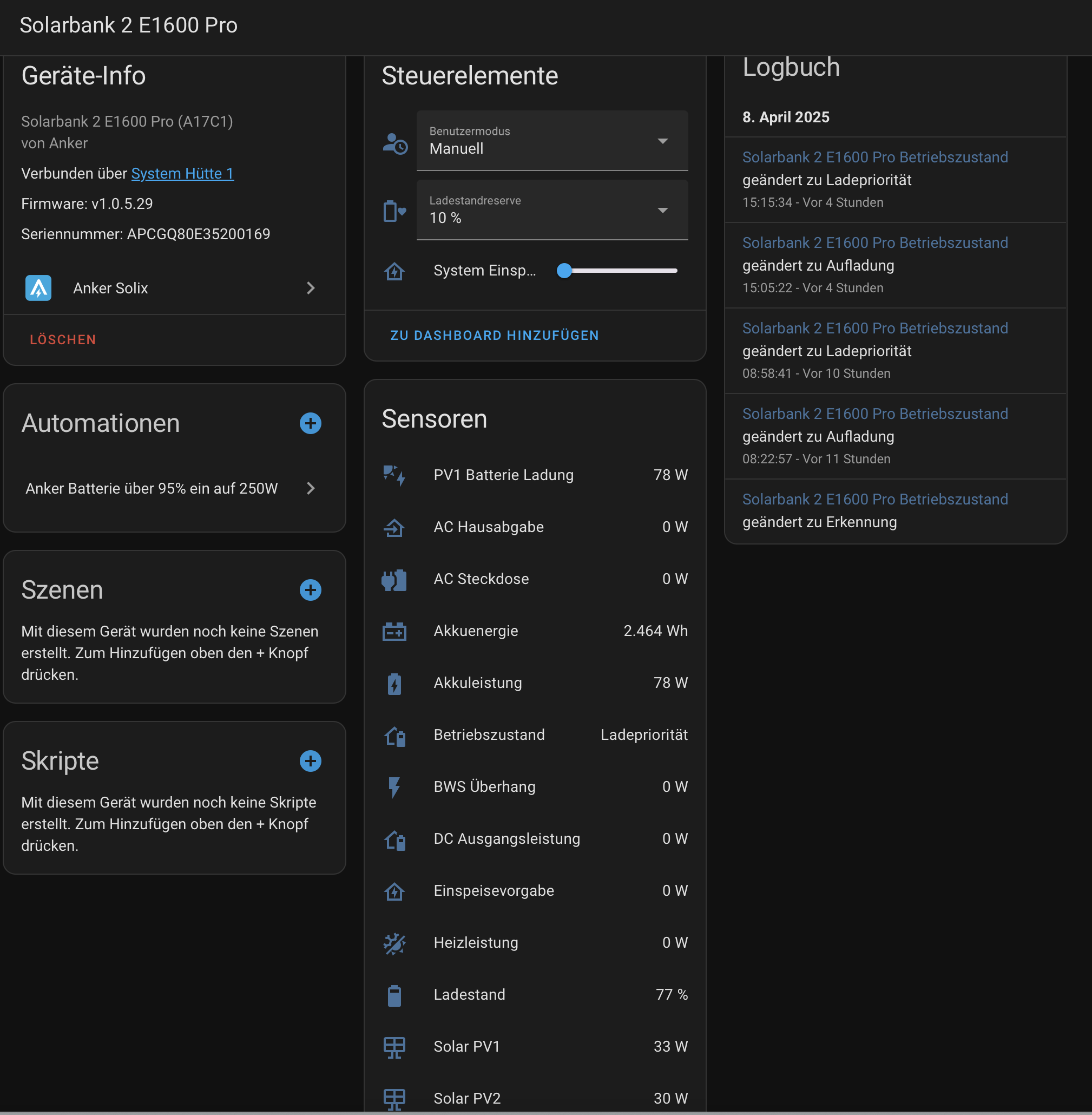Email & PW vom admin account der Handy App nehmen und die Optionen unverändert übernehmen…wir haben jetzt 3 neue Geräte unter Anker, interessant ist nur die Solarbank und im Grunde auch nur die markierten Sensoren: Betriebszustand meldet, was der Akku gerade tut: