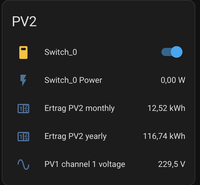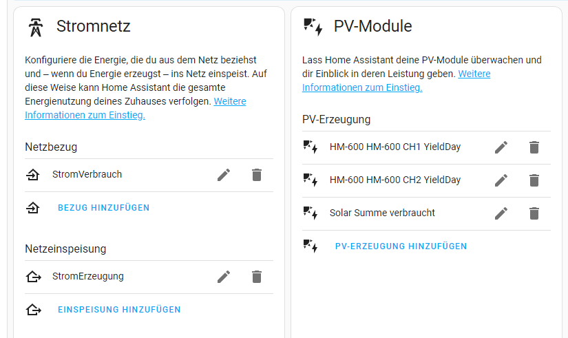 Daran sind die Module angeschlossen und in der Integration siehst du dann den Zustand und die Erzeugung der einzelnen Module. Ich habe zwischen dem Anschluss ans Hausnetz noch einen Shelly Plus 1PM gesetzt. Den habe ich dann bei Solarertrag im EnergyDashbord eingerichtet. Somit sehe ich was die Bank abgibt.