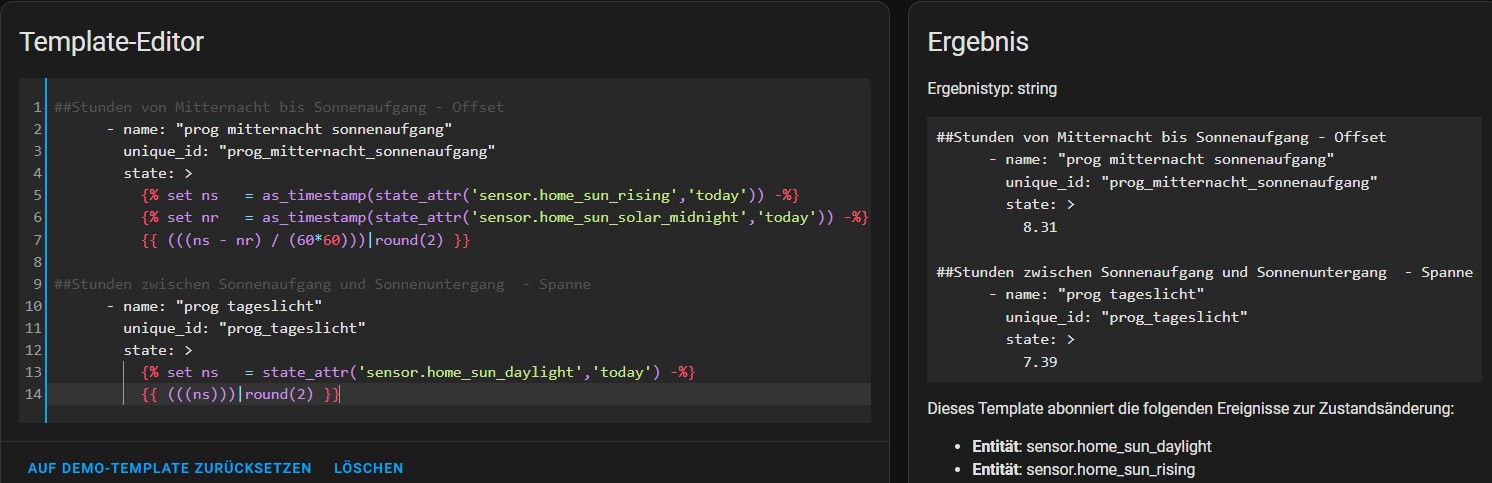 In etlichen Beispielen habe ich gesehen, daß es umgekehrt (Dezimal zu Datum/Zeit) recht einfach ist. Vielleicht bin ja auch im Moment einfach nur Blind. Eine einfache Lösung für die Stundenzahl von Tageslicht habe ich mit der SUN2-Integration verwirklicht (Daylight). Erst wollte ich ja nur die Differenz zwischen Sonnenaufgang und -Untergang. Das funktionierte aber nur am Abend, wenn sich beide Zeiten innerhalb des Tages befanden.