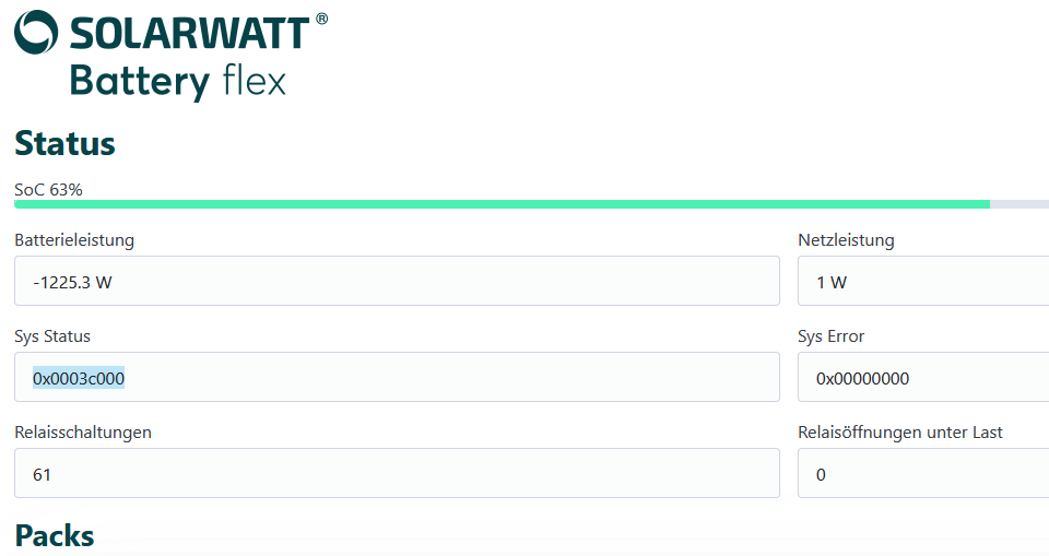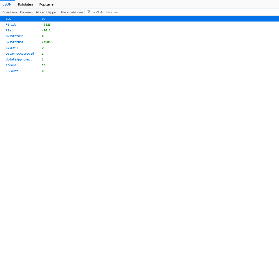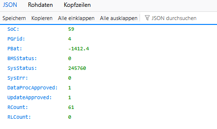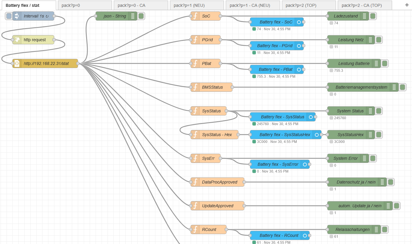 Ich lese die Daten des Speichers und der Packs mit NodeRED aus. Den Speicher erreiche ich über seine IP-Adresse/stat und die Packs IP-Adresse/pack?p=0 bzw. =1 für das Zweite Pack und so weiter. Die Daten liegen in JSON-Format vor.