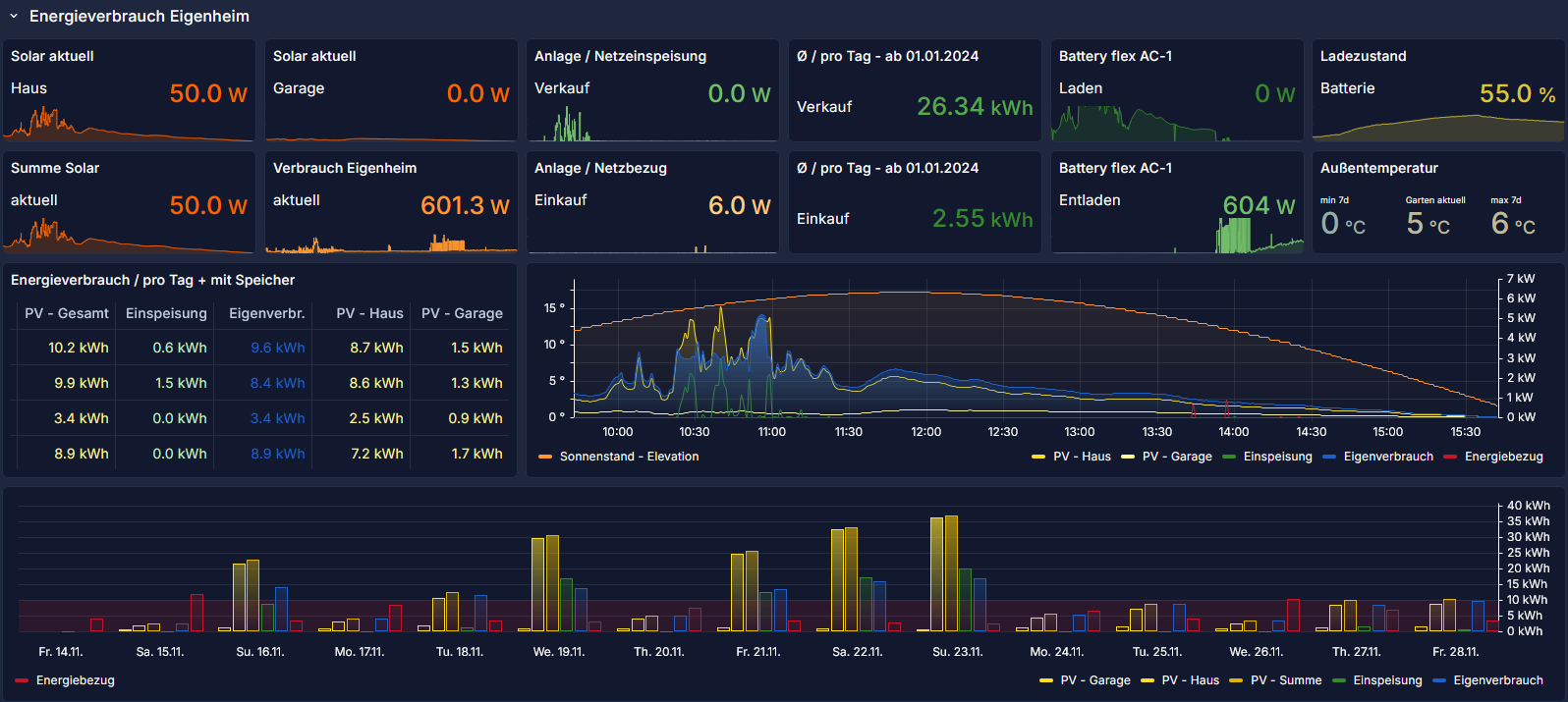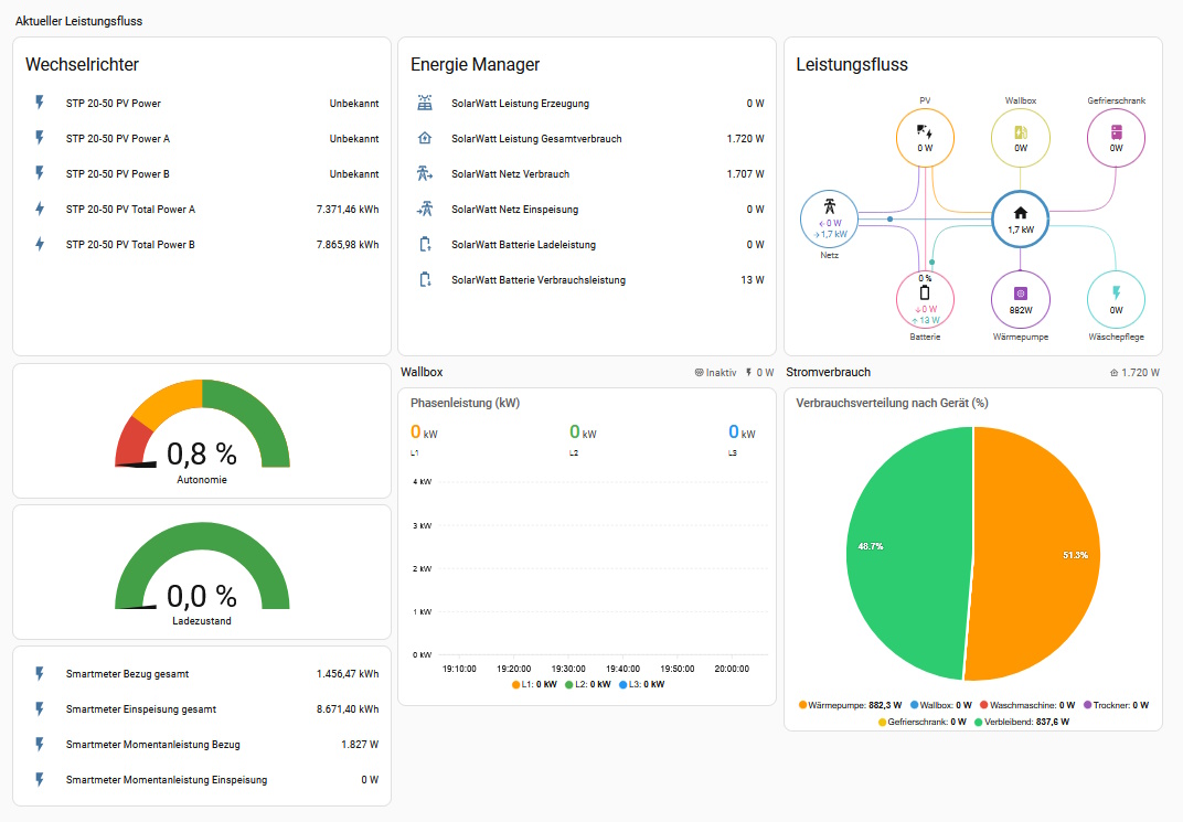 Kurze Erläuterung: das Dashboard sieht im Moment nicht so beeindruckend aus, da es Nacht ist und unsere PV-Anlage nichts produziert ![]()