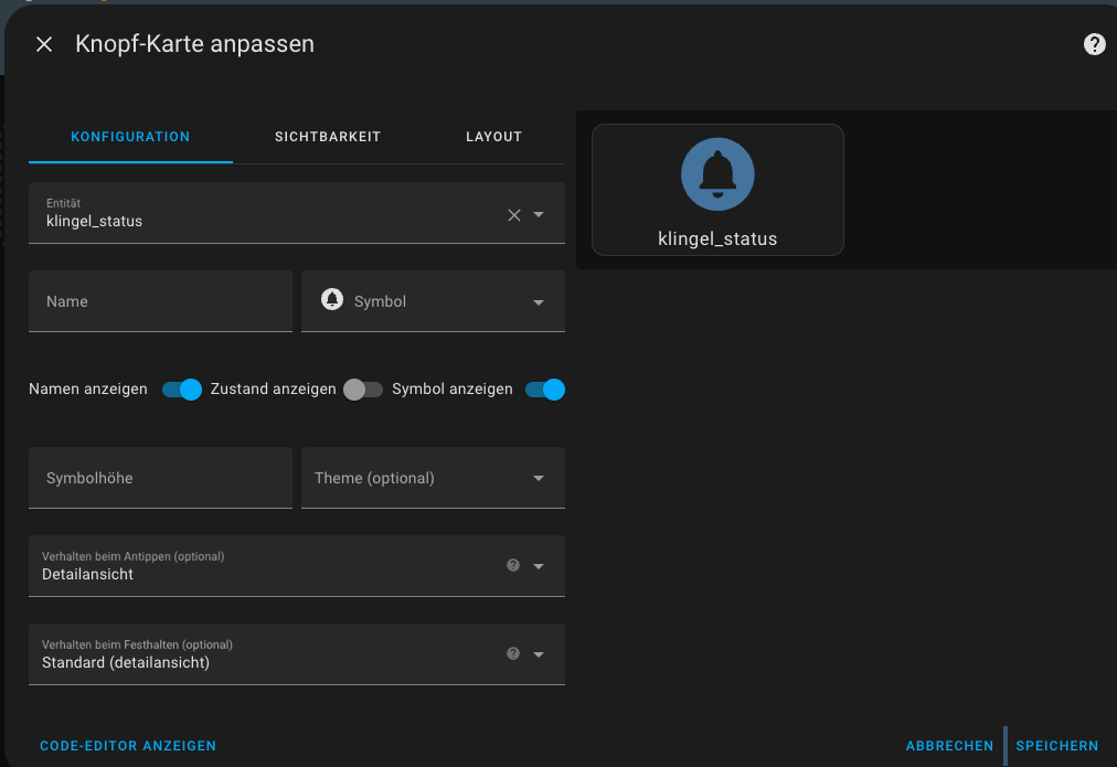Dann eine Karte erstellen und die Entität klingel_status einfügen.