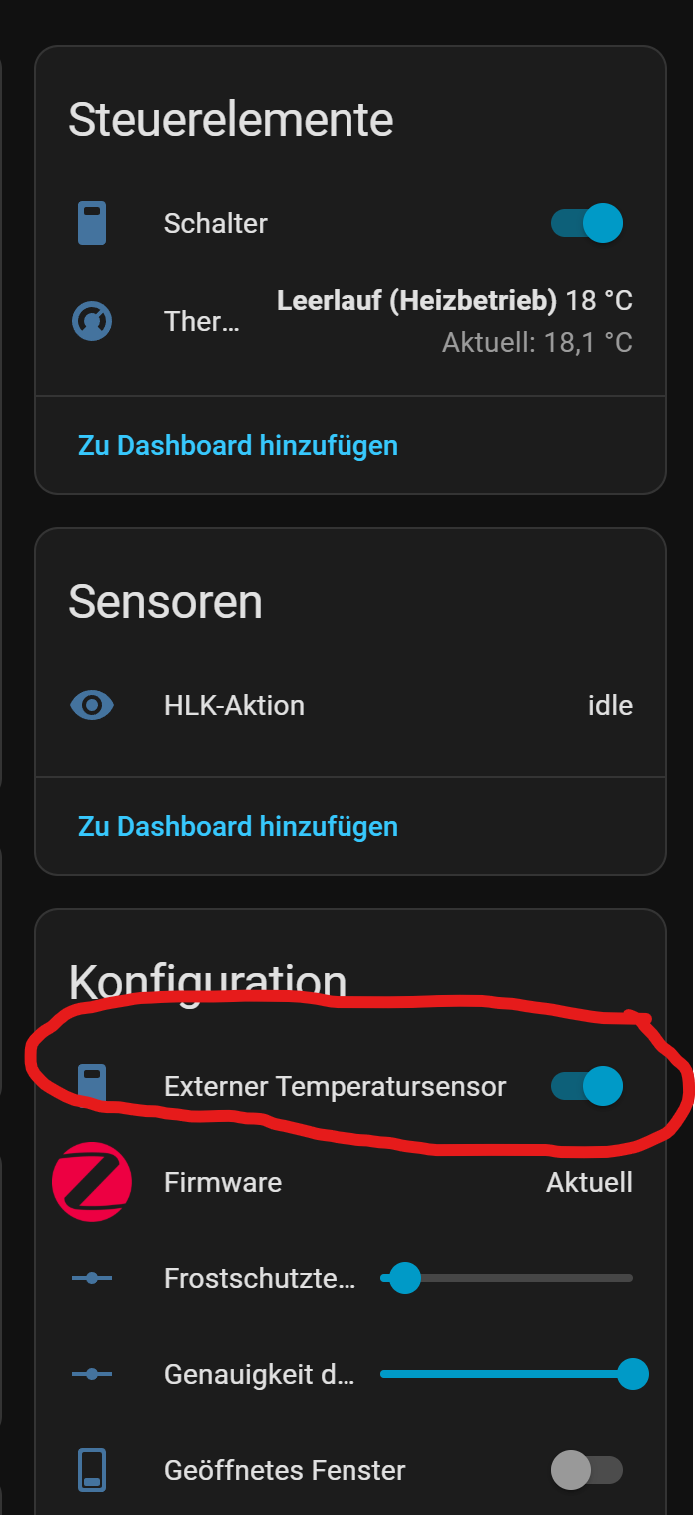 Im TRVZB muss noch der Schalter bei “externer Temperatursensor” auf EIN
