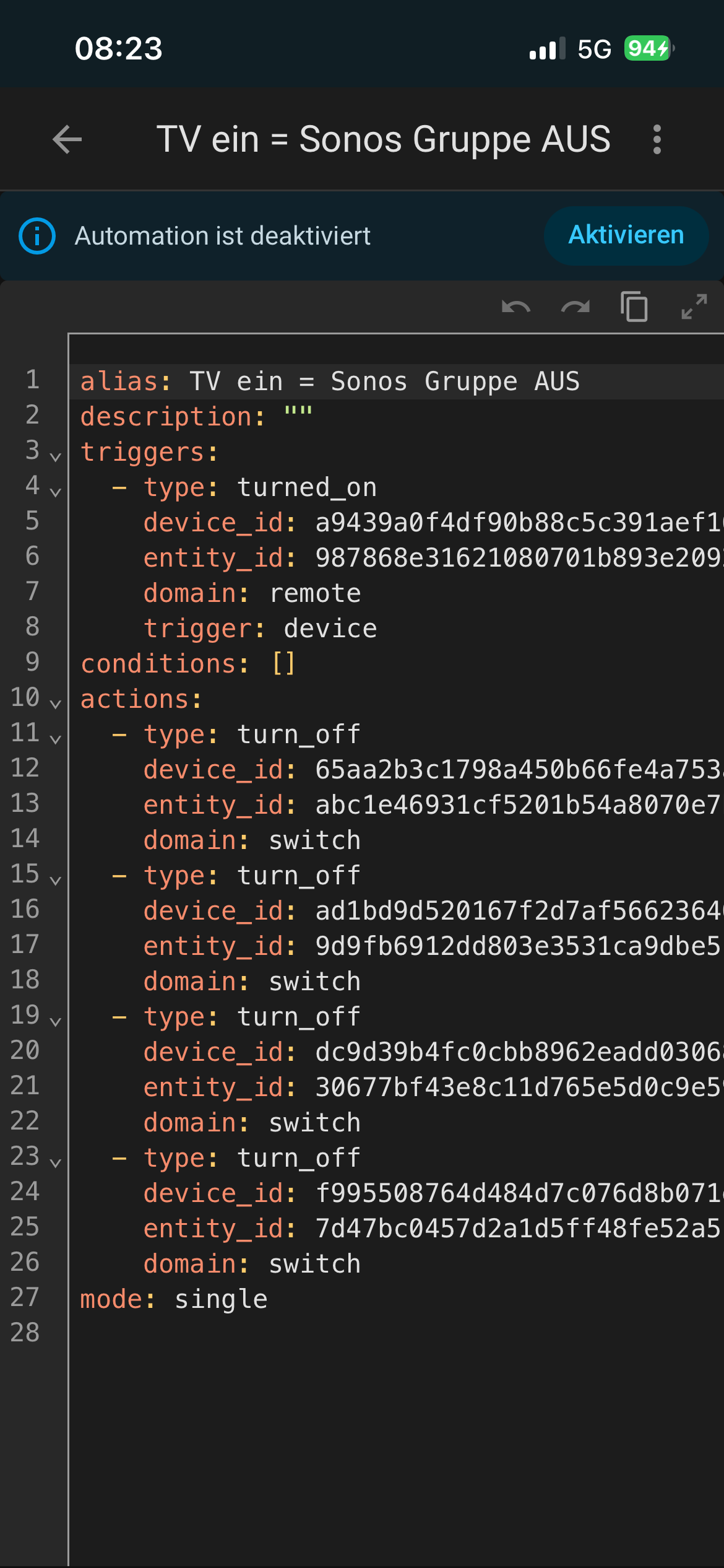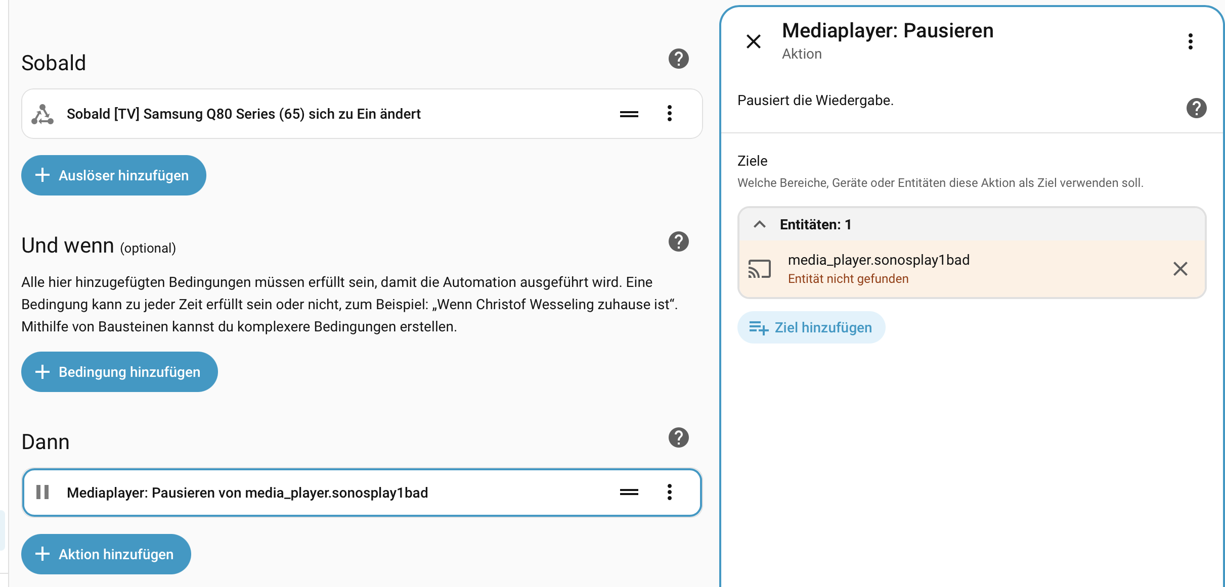 ich hab eine Automation erstellt, die bewirken soll, dass meine Gruppe von 4x Sonos Play1 die für gewöhnlich nach Feierabend bei mir zuhause läuft, abschaltet, sobald ich mein TV anschalte.