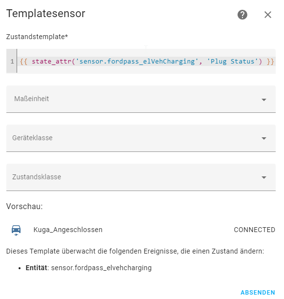 Ich habe die Entität sensor.fordpass_elvehcharging, diese hat unter anderem das Attribut ‘Plug Status’ mit den Werten ‘CONNECTED’ oder ‘NOT CONNECTED’.