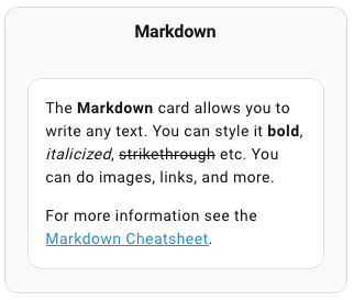Hallo, ich möchte auf einem Bereich im Dashboard einfach ein paar statische Daten anzeigen, z.B. meine aktuellen Strom/Gas Lieferkonditionen, inkl. Laufzeiten. Also im Grunde nur Text. Wie mache ich sowas am besten? Muss ich dafür virtuelle Entitäten erzeugen?