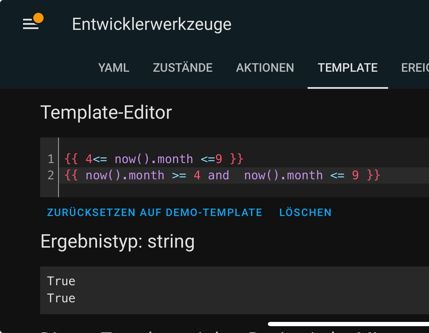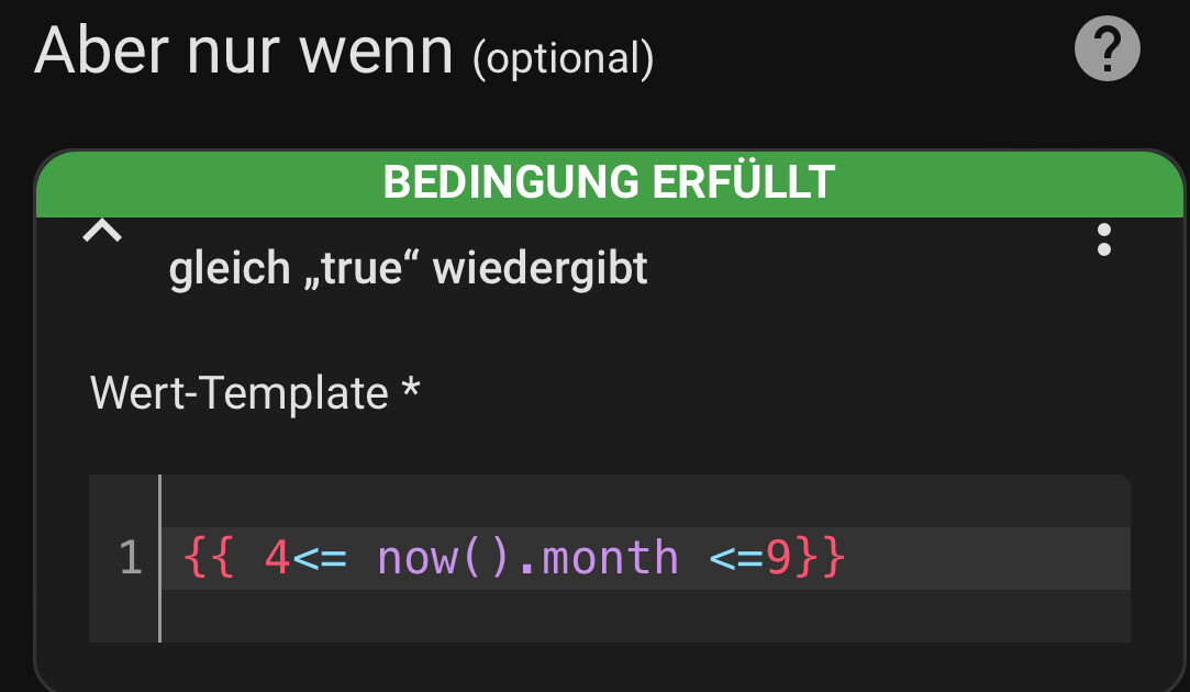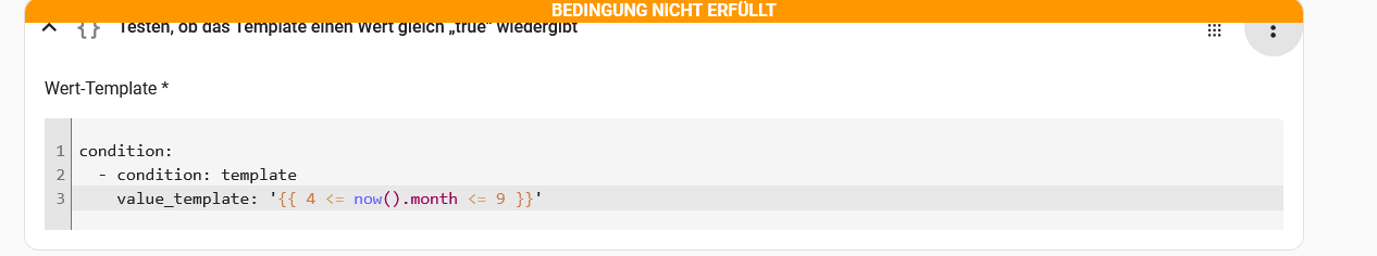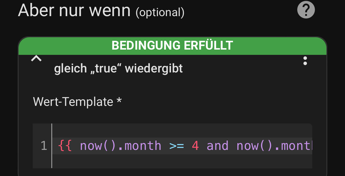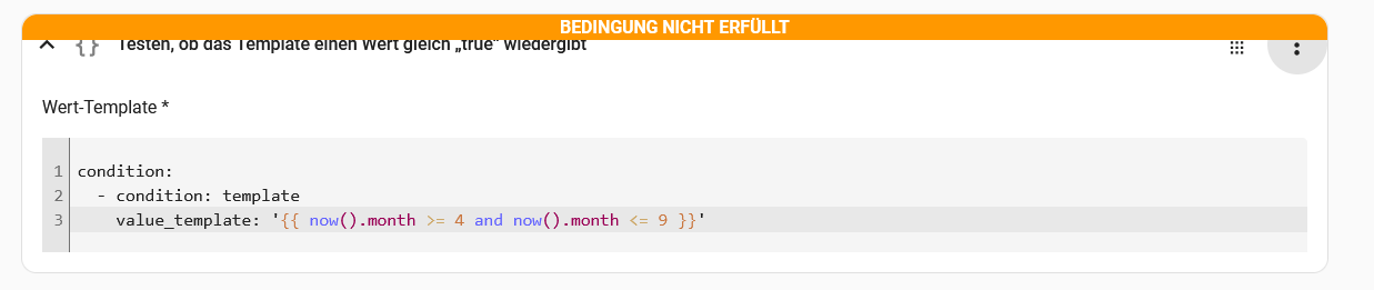 ich versuche gerade eine Automation für eine Gartenbewässung die Monatsabhängig sein soll zu verwirklichen, also nur von April bis September, packe alles bei “Aber nur wenn” das Template rein, mir wird aber leider beim testen folgendes angezeigt “Bedinung nicht erfüllt”, habe schon viele Varianten ausprobiert, also auch "condition: weg gelassen oder “- condition: template:” und sehe einfach nicht welchen Fehler ich mache, anbei mal ein Screenshot
