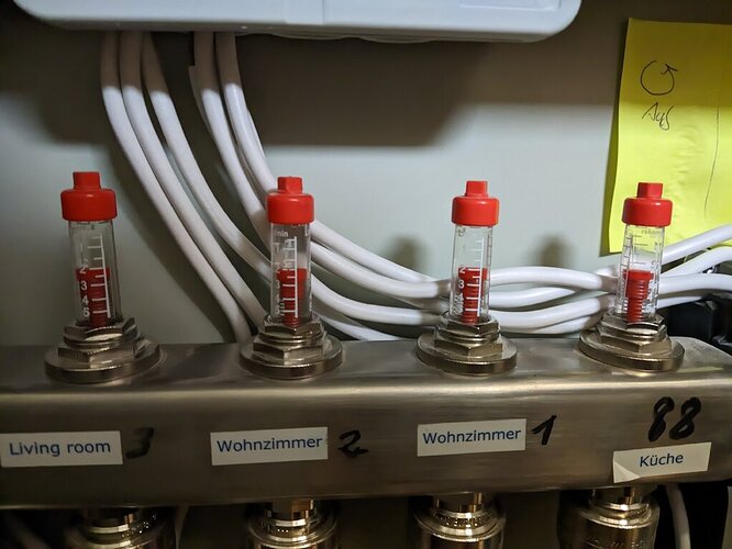 Auf dem anderen Bild sieht man etwas, was ich im Fußbodenverteiler in einer Ecke reingesteckt gefunden habe. Es ist offensichtlich nicht meine Handschrift und gehört gegebenenfalls zum Heizungsbauer. Entweder sind es die Faktoren, von denen du gesprochen hast oder die Durchflussmengen oder irgendetwas ganz anderes
