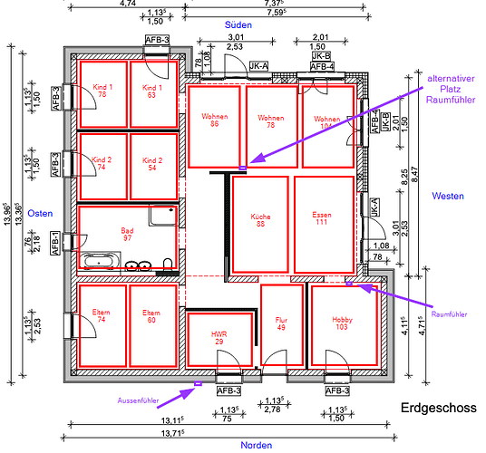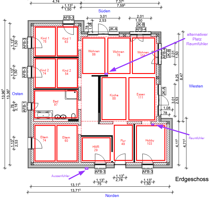 Ich kann dir nicht sagen, wie man mit Raumfühler arbeitet, ob es besser im Hobbyraum oder Wohnzimmer ist. Ich würde nur nach dem Außenfühler gegen ohne Raumfühler, Außenfühler an Ost und West.