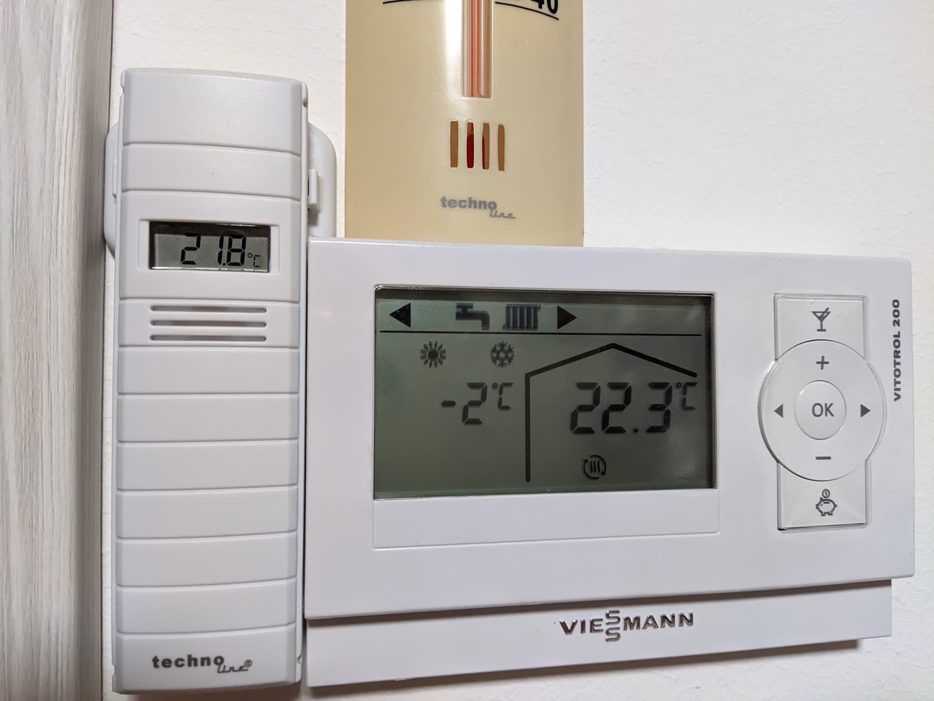 Ich häng mal hier noch zwei Bilder an. Das eine ist vom Wohnraumfühler der in Hobbyraum hängt (den müsste ich ins Wohnzimmer umbauen). Daneben ist auch mein Funkthermostat zu sehen und schon die Abweichung der beiden macht mich kirre…