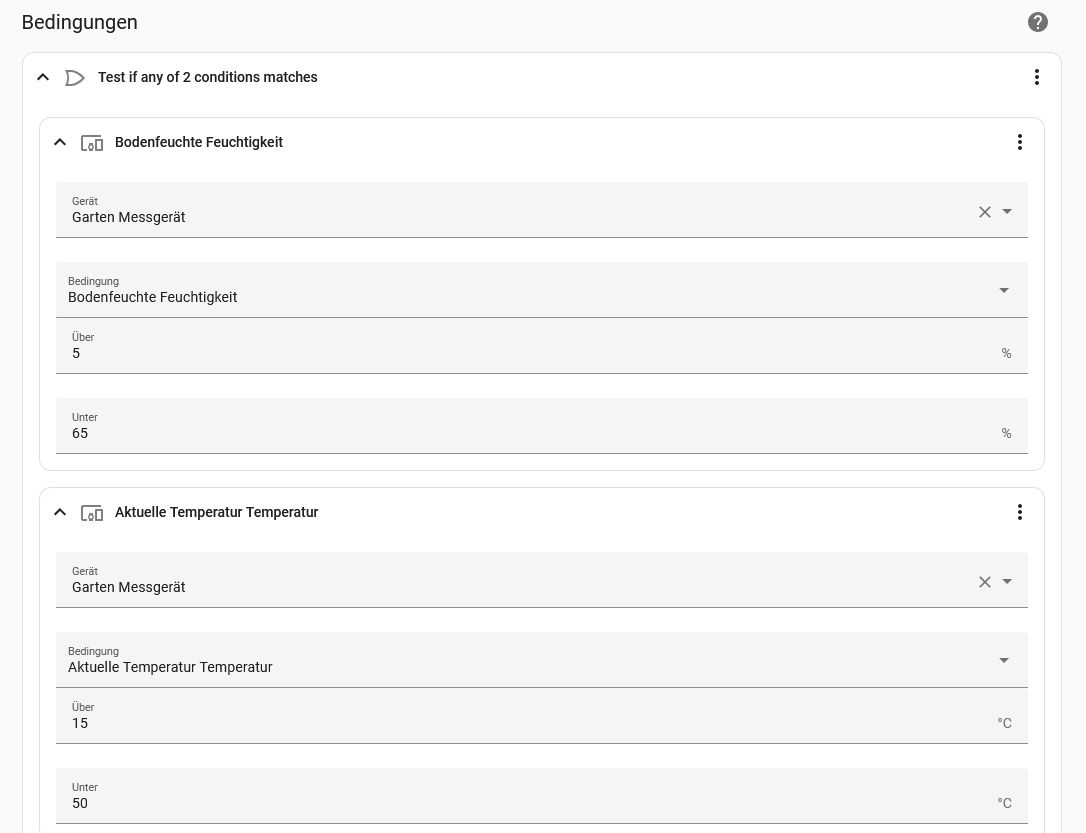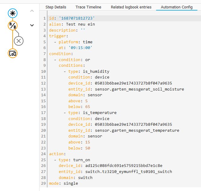 ich hab seit einiger Zeit einen Bewässerungsventil damit ich meine Pflanzen gesteuert bewässern kann. Dazu hab ich einen Temperatur und Feuchtigkeitsfühler. Da ich nicht weis wo der Fehler in meiner Automatisierung liegt muss ich hier mal fragen. Das Video mit den verschiedenen Möglichkeiten mit und, oder usw. hab ich mir schon angesehen und vielleicht hab ich da was falsch verstanden. Wenn ich die Automation einrichte, daß aus dem Sensor, zu eienr bestimmten Uhrzeit, die Bodenfeuchte und die Bodentemperatur ausgelesen wird und dann je nach Zustand die Bewässerung eingeschaltet wird, wird mir im Log angezeigt das es geschaltet hat aber es hat dann doch nicht geschaltet. Ich hab mal ein paar Screenshots beigefügt vielleicht erkennt ja jemand warum das so ist. Das Abschalten funktioniert immer einwandfrei, da wird aber auch nichts ausser der zeit ausgewertet.