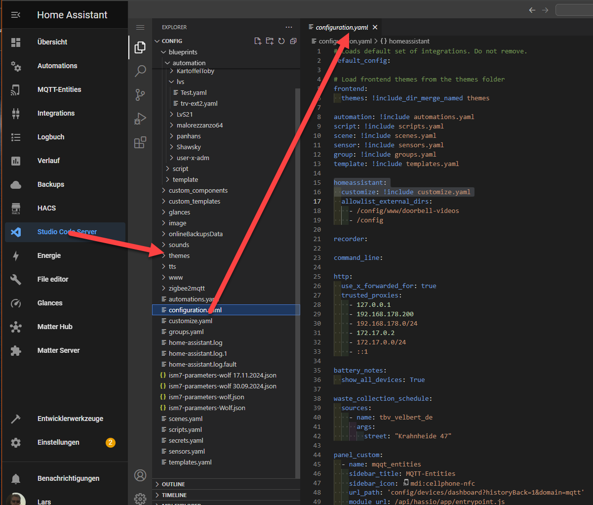Ich habe mein Customize in eine eigene Datei der HA Konfiguration ausgelagert. In meine configuration.yaml des HA habe ich daher folgende Zeilen: