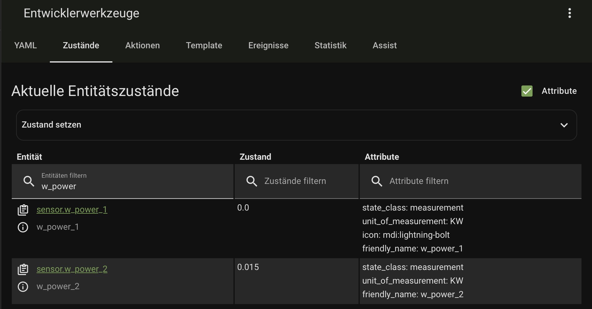 Wenn ich das richtig sehe müsste ich Power_1 und Power_2 im Energiedashboard einfügen, allerdings werden mir die Entitäten nicht angezeigt. Aller versuche was umzurechnen sind gescheitert. Entweder mit Fehlermeldungen oder ich habe nur einen zweiten Zähler erstellt.
