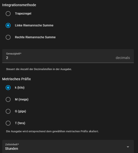 Nun möchte ich den Verbrauch auch im Energy Dashboard beobachten. Hier werden ja Sensoren z.b. in kWh benötigt. Also dachte ich mir, dass ich den Watt Sensor für die Summe nehme und per Riemann Integral in kWh übertrage.