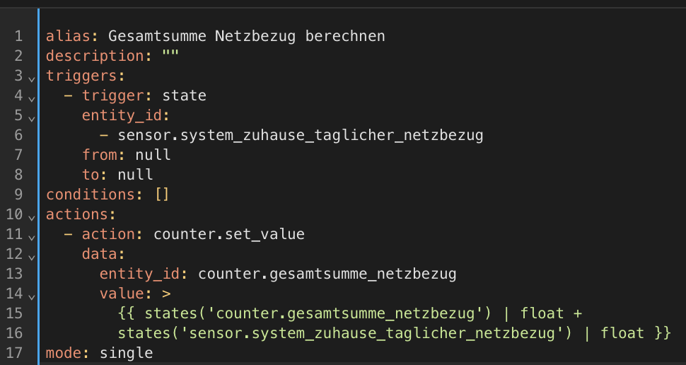 Ein Gedanke wäre noch, die Berechnung nur einmal z. B. 23:59Uhr oder so durchzuführen, dann hätte ich immer einen Tagesaktuellen Zählerstand. Das wollte ich aber erstmal nicht machen, sondern immer genau dann berechnen, wenn sich der Netzbezug oder Netzeinspeisung auch verändert.