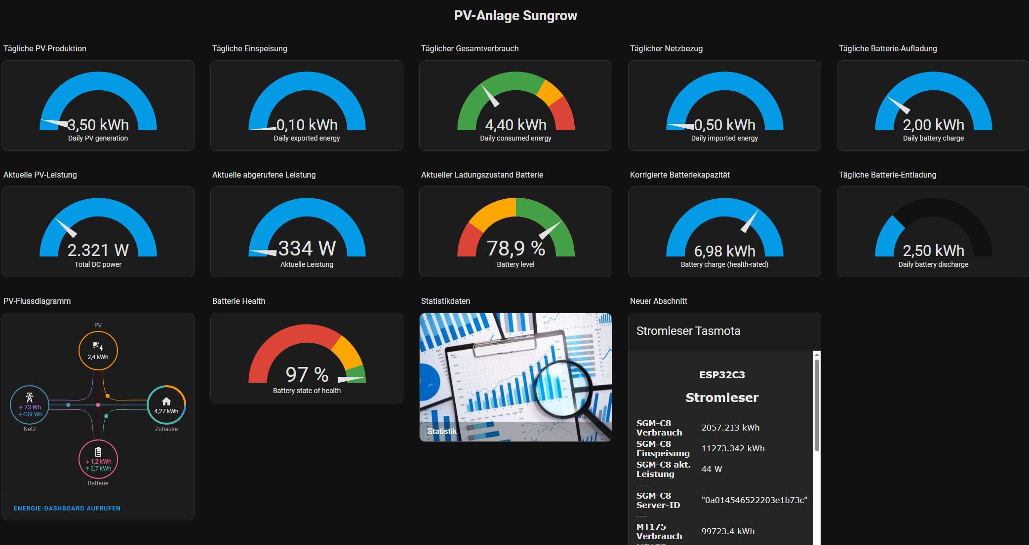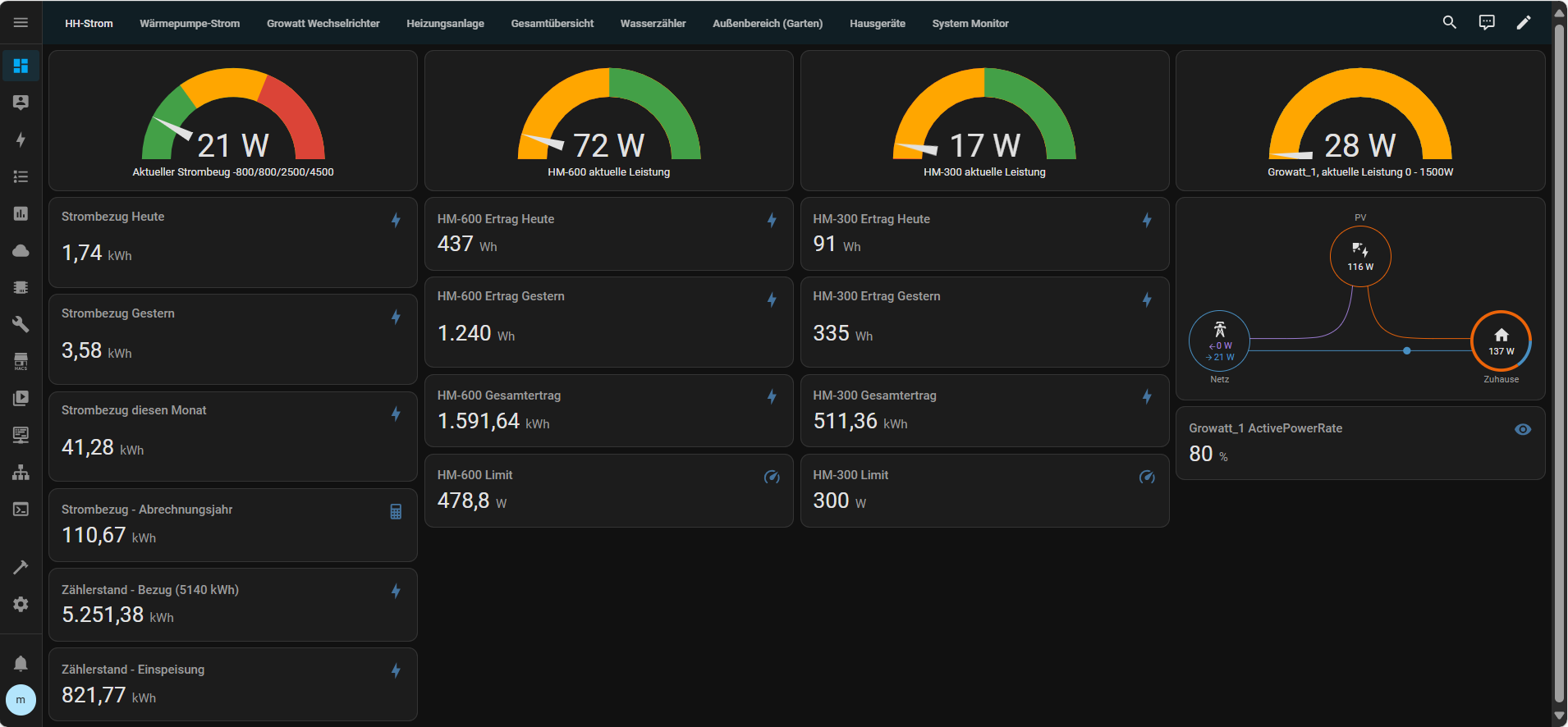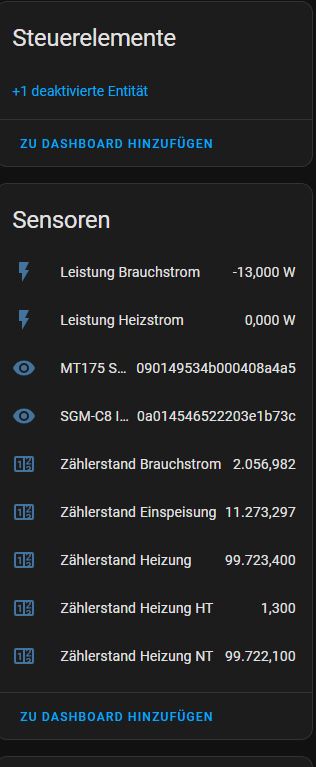 Einbinden in HA musst du das ganze schon selbst. Hier ein Beispiel. Links die Zählerdaten, rechts die PV-Anlagen, die leider, wegen starker Bewölkung, nicht viel leisten.