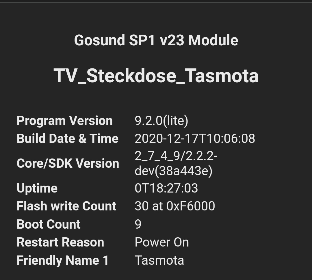 was für eine Tasmota Version ist auf dem Gerät (vermutlich ja eine Steckdose) installiert? Ich hoffe keine Lite-Version?