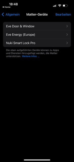 Wenn ich ein Gerät mit der Hersteller App hinzufüge, funktioniert alles wunderbar. In der Eve App sieht man dann das die Geräte mit Apple TV über Thread verbunden sind. Das Thread Netzwerk funktioniert also. Zur Prüfung habe ich bei dem Nuki Smart Lock Pro das Wlan ausgeschaltet. Das Schloss funktioniert über die Home App einwandfrei.