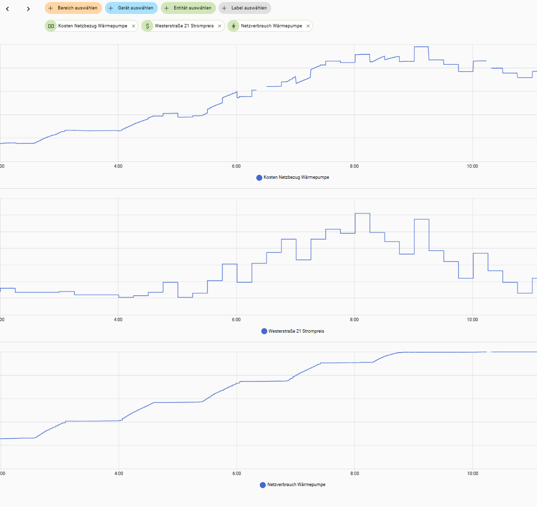 ich habe seit ca. 1 Monat eine Wärmepumpe und möchte wissen, was die so im laufenden Betrieb kostet. Meinen Strom beziehe ich über Tibber und habe dazu eine 10,6kWp PV-Anlage mit Speicher. Die aktuelle Leistungsdaten zu Netzbezug, Gesamtverbrauch und WP bekomme ich über entsprechende Sensoren.