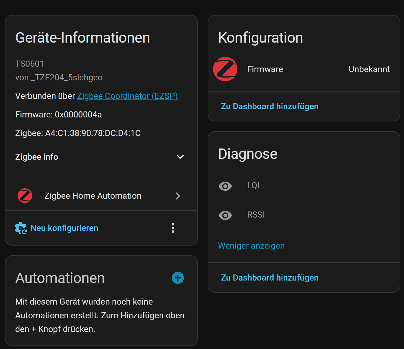 Aufgrund des Wechsels von Homematic zu HA muss ich mich von meinen Rolladenschaltern trennen und habe festgestellt, dass es da ziemlich mau bei ZigBee aussieht. Den wirklich optisch schönen Schalter Tuya habe ich testweise eingebaut und wollte ihn nun in HA integrieren. Leider scheitere ich schon an der Integration in Smart Live. Mit dem Profil/Scan in der Bedienungsanleitung gelange ich direkt in “Curtain Switch hinzufügen”, dann kommt die Nachricht “Kein verfügbares Gateway”. Mein HA läuft aber mit einigen Plugs im gleichen Raum problemlos.