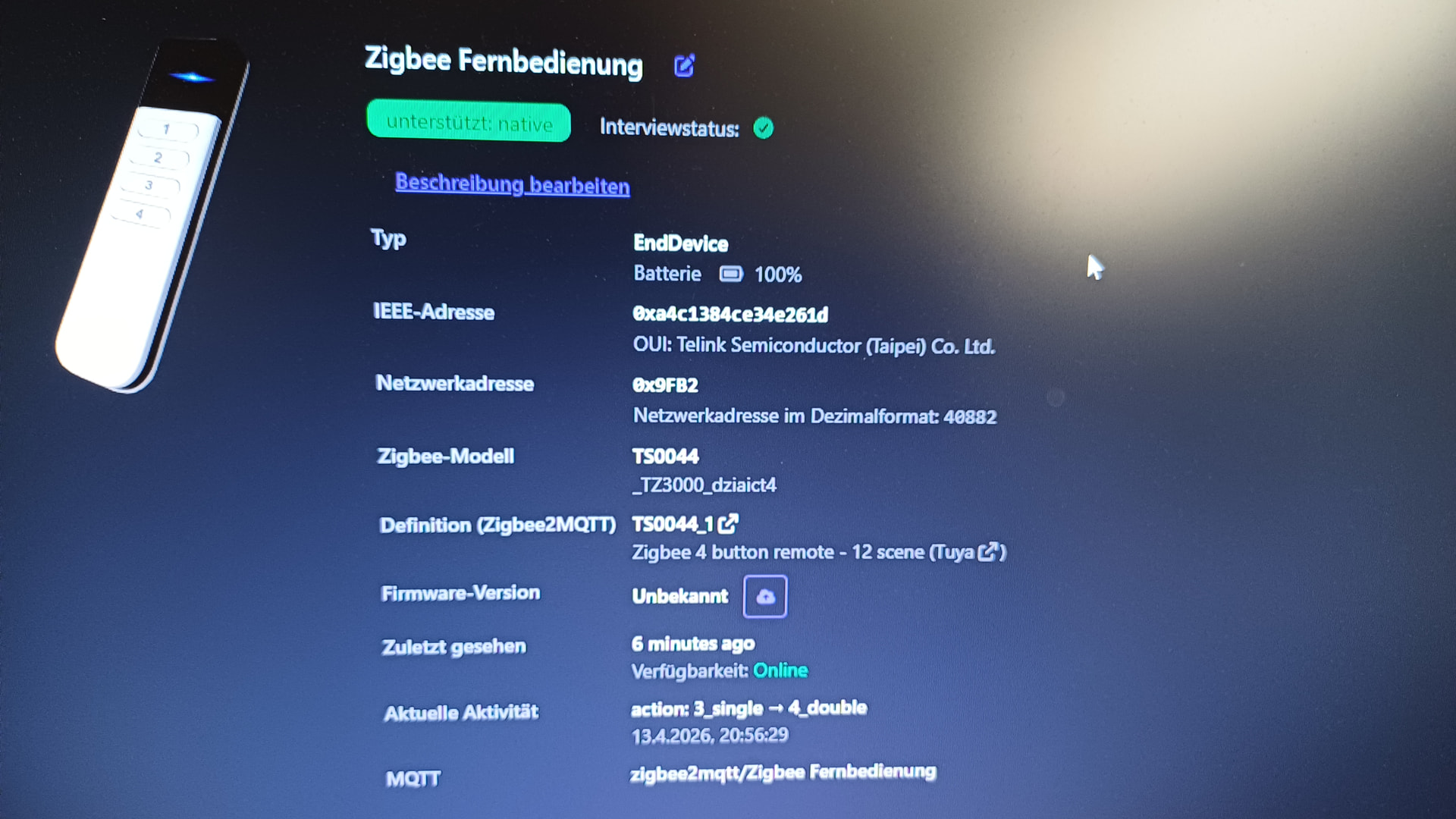 Habe mir diese Fernbedienung zugelegt TS0044_1 Zigbee 4 Button remote. Nun wollte ich damit jetzt 4 Steckdosen schalten, In zigbee2mqtt wird sie gefunden aber ich komme jetzt nicht weiter so das ich den Tasten die Steckdosen zuweisen kann.