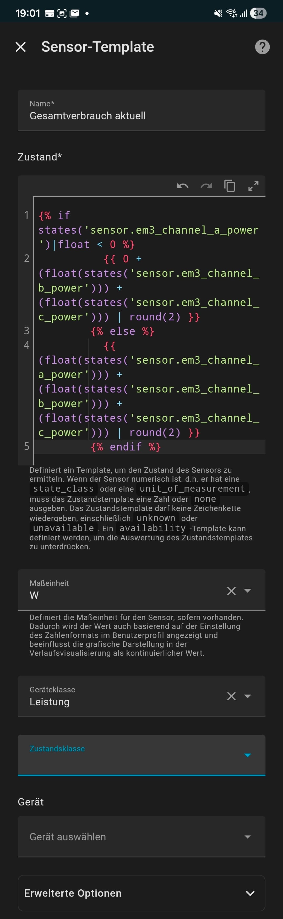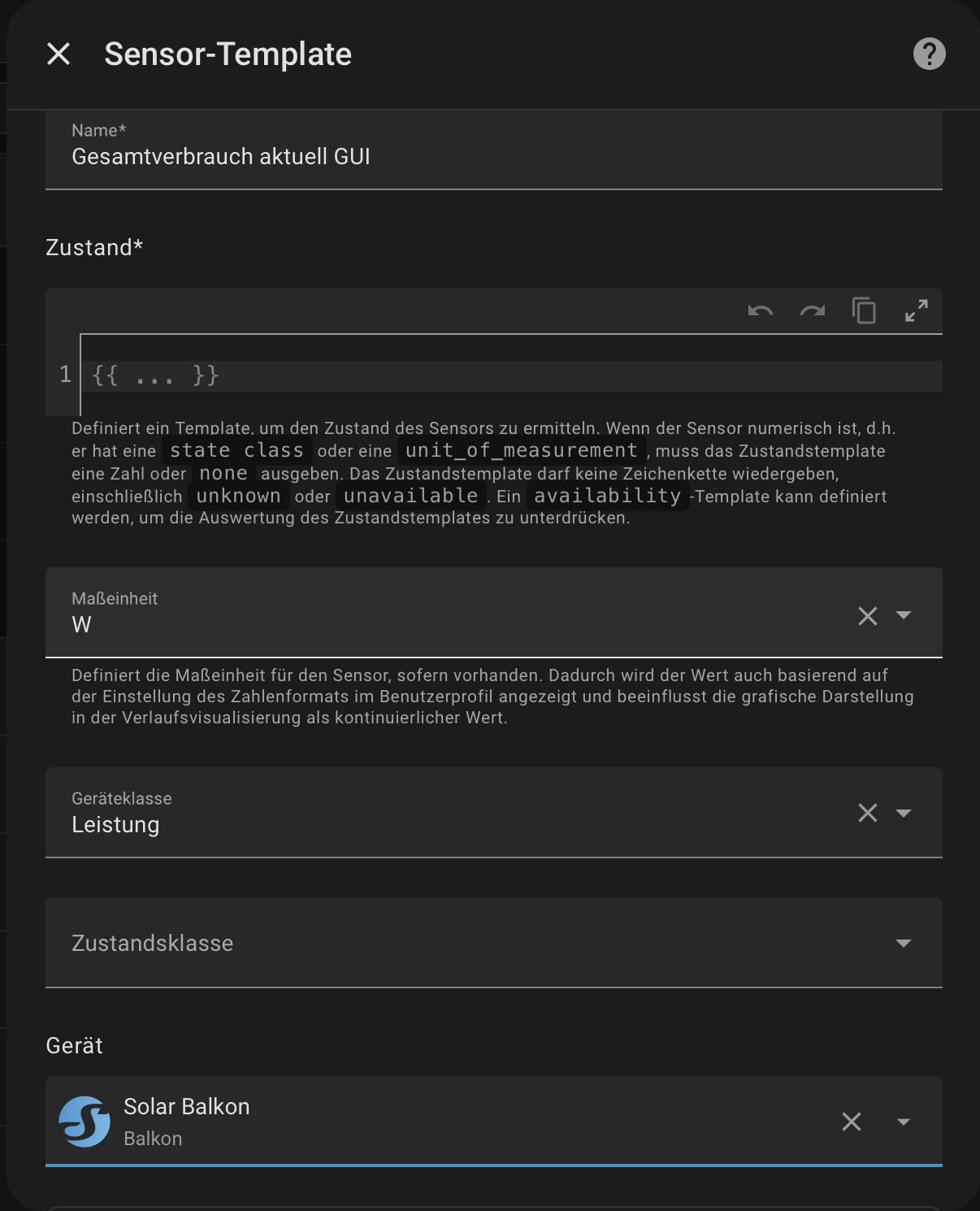 In der Home Assistant GUI (Einstellungen → Geräte & Dienste → Helfer → Neuer Helfer → Template-Sensor) gibst du nur die Template-Logik ein – nicht den kompletten YAML-Block.