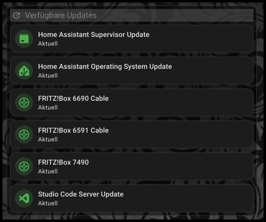 Ich hätte jetzt gern eine Anzeige auf dem Dashboard, ob es Updates gibt. Eine Liste mit auto-entities das habe ich schonmal hinbekommen, aber für das Hauptboard ist die doch etwas lang. Wie kann ich mir jetzt einen Helfer erstellen, der mir sagt “es sind xx Updates verfügbar” und mit Klick dann auf die Liste springt. oder das Symbol/ Schrift je nach Zustand grün oder gelb eingefärbt wird.