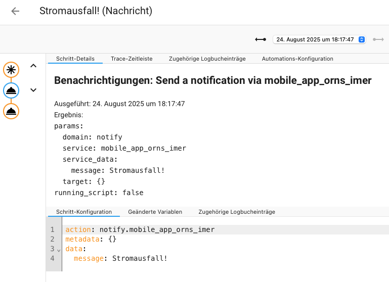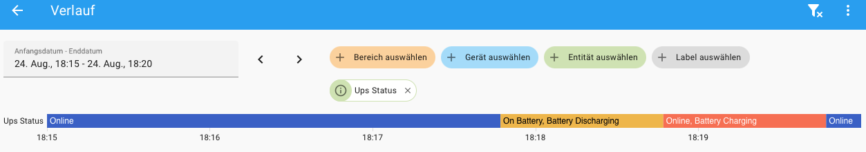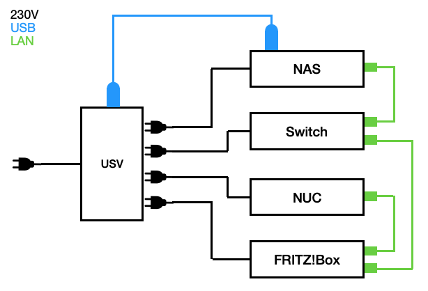 Ich hab jetzt … “einige Tage” damit verbracht mein System, eine USV (CyberPower 1350), ein NAS (Synology DS224+) und einen Mini-PC (NUC8i5BEK2 mit HAOS) an meiner FRITZ!Box (7520 AX), zum Laufen zu bringen. Rein vom Ablauf, d.h. hardwareseitig, läuft es. Ich ziehe den Stecker der USV, sie schaltet auf Batterieversorgung um und das NAS, der NUC, die FRITZ!Box (und ein 5-Port-Switch) werden, laut Anzeige der USV bis zu 200 Minuten, aus der Batterie versorgt. Es kommt eine Nachricht, dass es einen Stromausfall gibt: