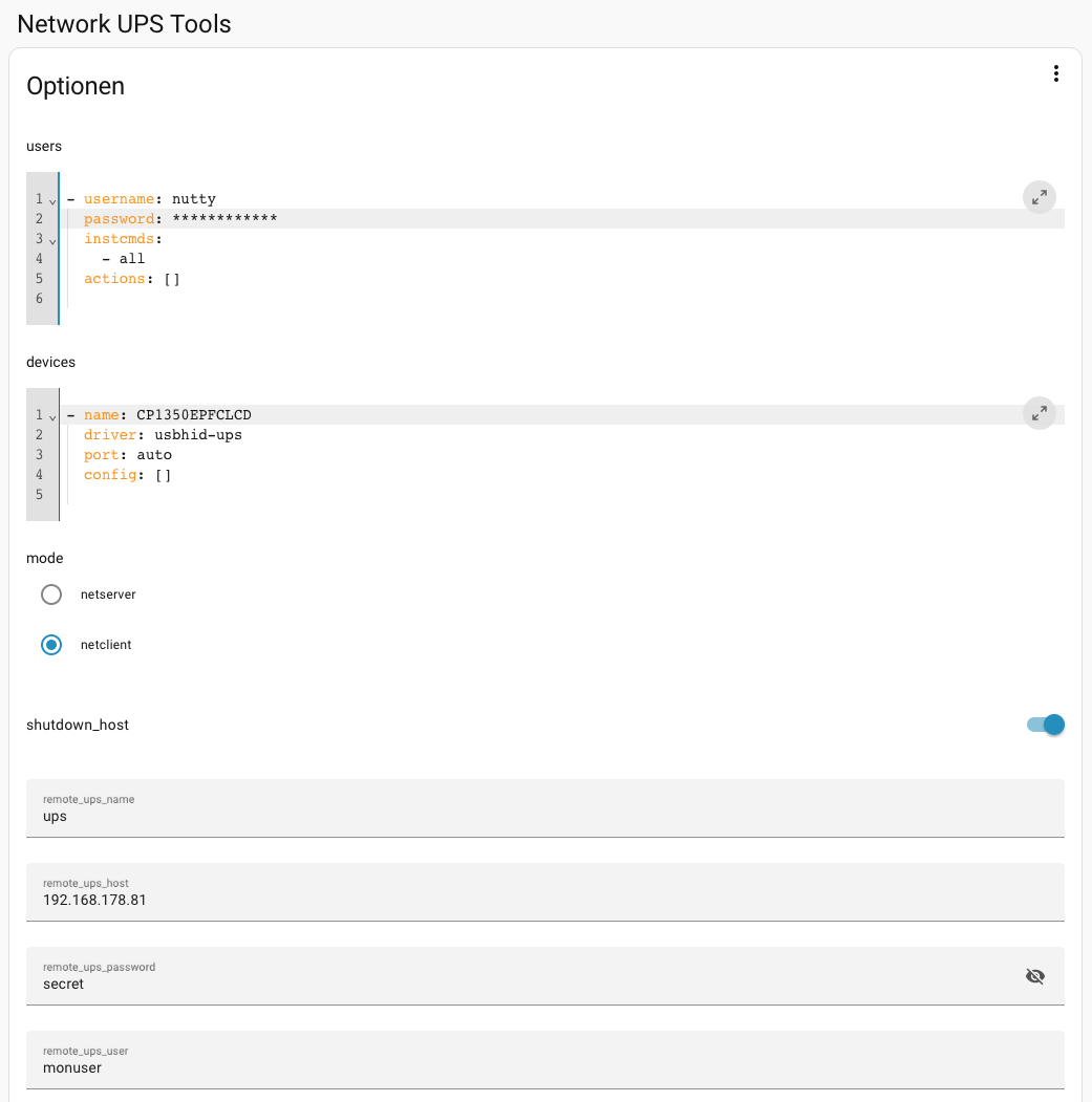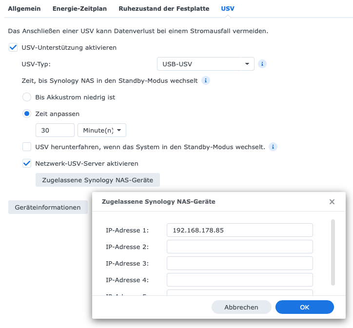 D.h. ich stell in der Automation einen Trigger von below 30 für das Herunterfahren von NAS und NUC ein und in der USV das wieder Versorgen bei 60%. Dann sollte das passen.