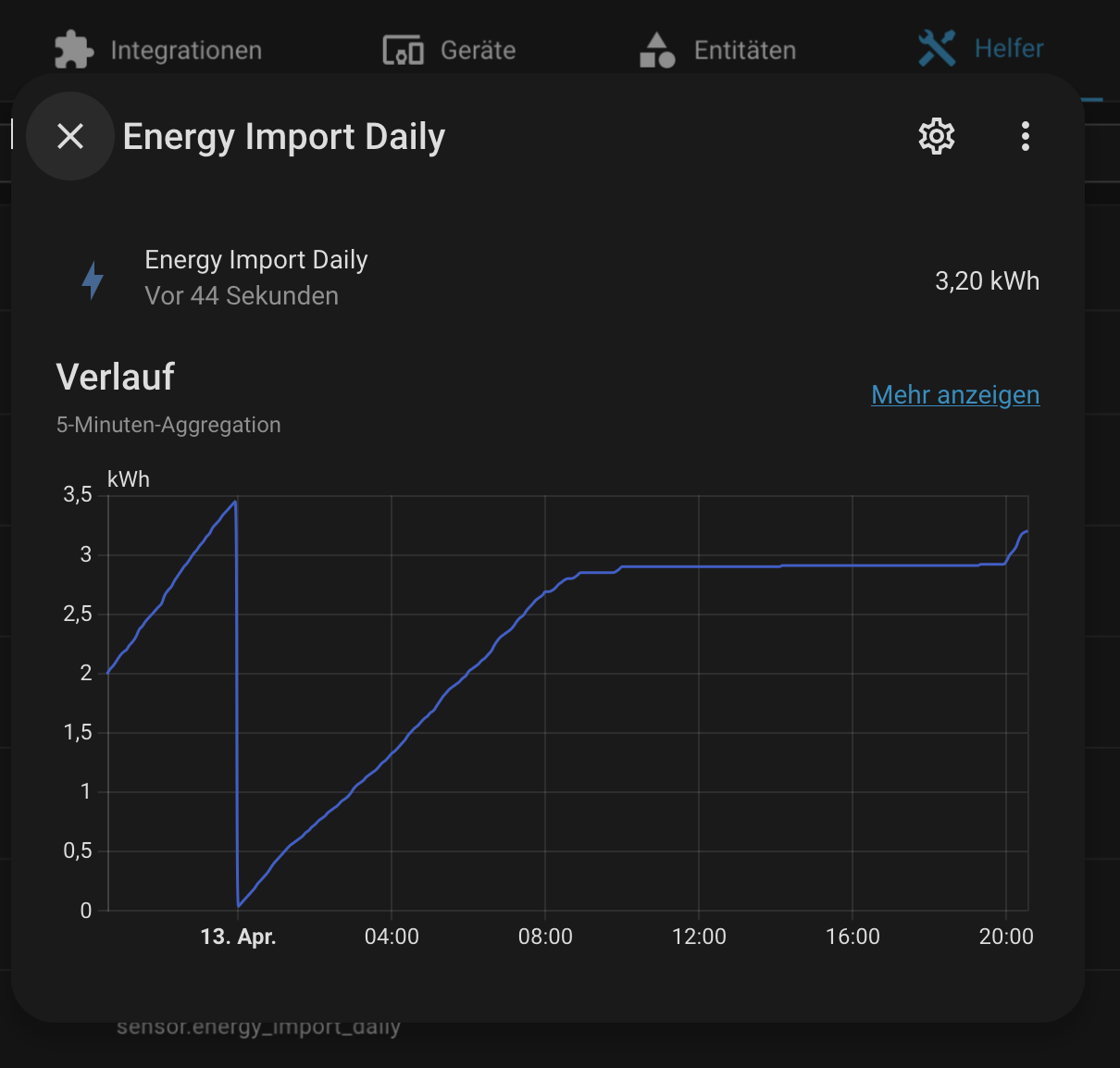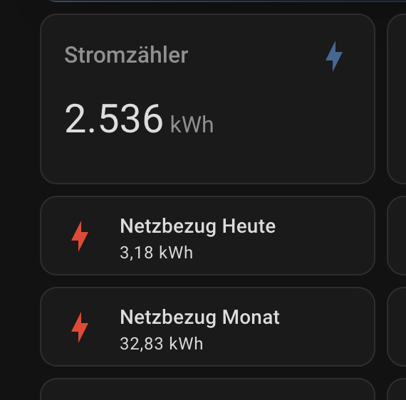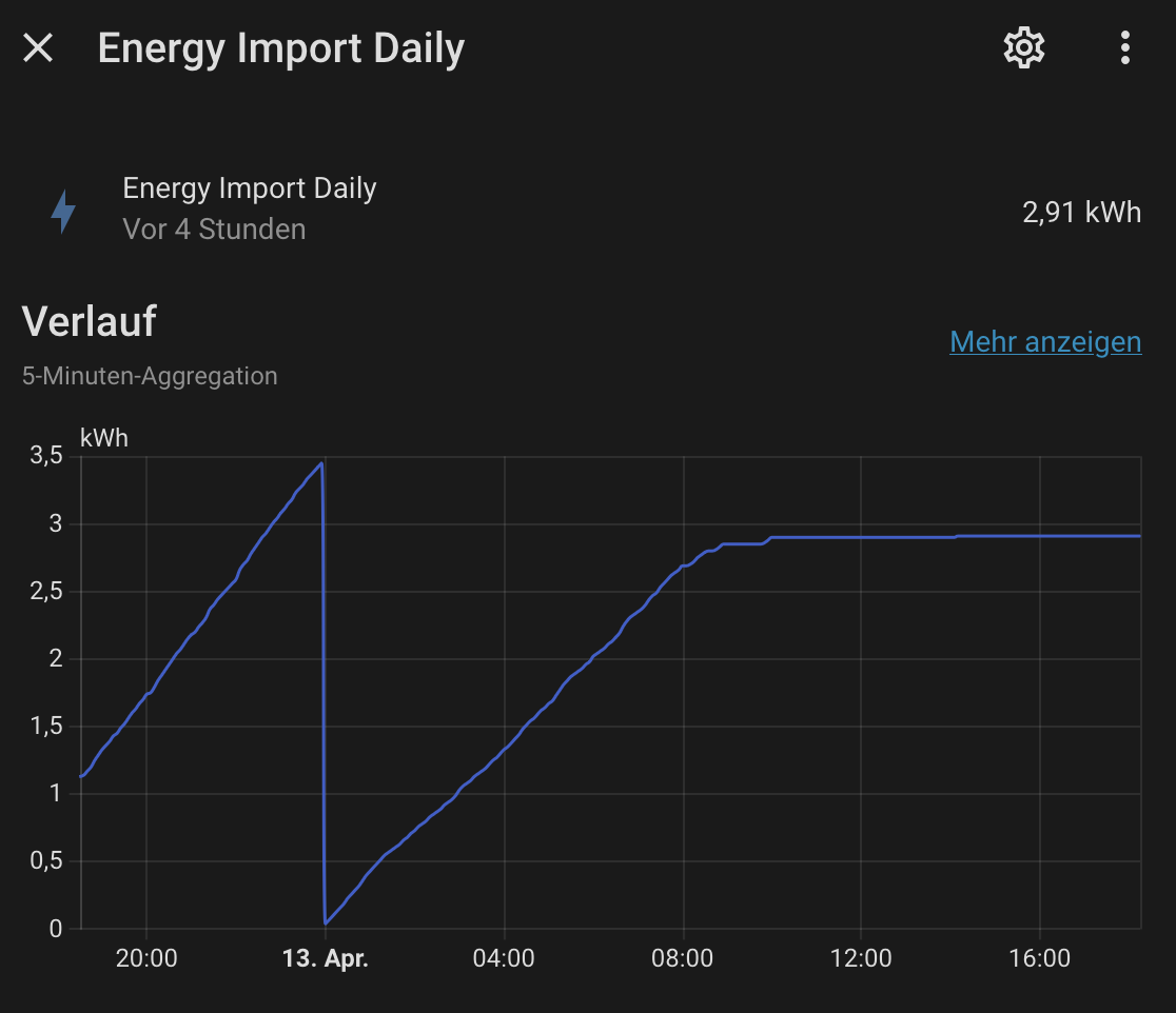 ich wollte gar keine neue Diskussion über Poweropti lostreten. Das Problem ist: wie konfiguriere ich den Zähler richtig. Die Werte des Gesamtenergieverbrauches kann ich sowohl in der Poweropti APP, als auch direkt am Zähler ablesen. Die stimmen überein. Auch die Entität stimmt. Es gelingt mir nicht, mit dem Zähler die richtige Differenz zwischen Startzeitpunkt (Mitternacht - der Zähler wird auch richtig zurückgesetzt) und der aktuellen Zeit bzw. Tagende zu ermitteln. Ich benutze dazu den Verbrauchszähler. Ich hab jetzt mal probeweise einen Integralzähler programmiert und die verbrauchte Leistung als Parameter eingesetzt. Das wird aber wahrscheinlich zu ungenau, da ja die Werte nur zu bestimmten Zeitpunkten übertragen werden. Irgendwie hab ich gerade nen Knoten im Gehirn…