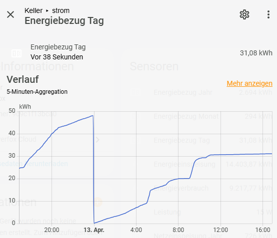 während der Poweropti (auch der Zählerstand direkt am Zähler) ca. 6kWh anzeigt, ist der Tageszähler bereits bei 31kWh. Eigentlich bin ich der Meinung, beim Zähler alles richtig eingestellt zu haben (Rückstellung aus, immer verfügbar aus und als Entität sensor.strom_enregieverbrauch vom Poweropti).