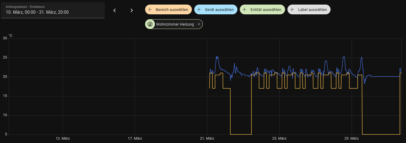 Du weißt aber das es bei HA eine Kurzzeitstatistik über nur 10 Tage gibt und eine Langzeitstatitik? Ich vemute mal Du hast Dir einen Verlauf von einer Entität angeschaut die nur in der Kurzzeitstatitik erfasst wird. 21.03. —> 31.03. = 10 Tage