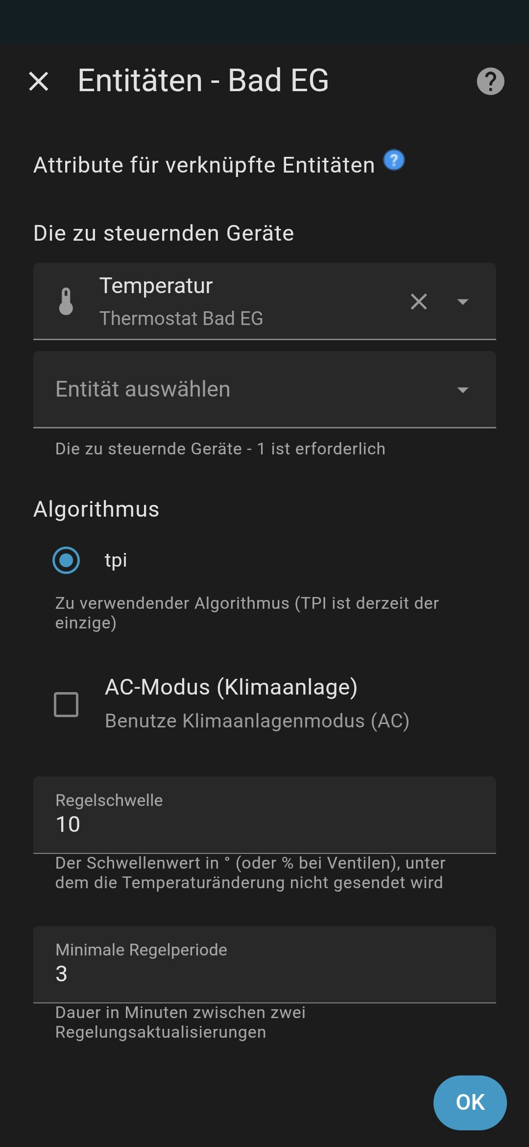 Ja das Handbuch habe ich durchgesehen. Ich stolper immer wieder über die gleiche Einstellung. Ich denke das es darum nicht richtig läuft. Dein Tip funktioniert leider nicht. Ich schicke noch ein Bild mit. Es geht immer noch um die zu Steuernde Entitäten. Over.climate kennt der nicht bzw nimmt er nicht an. Ich wüsste gerne was du oder andere dort Eintragen.