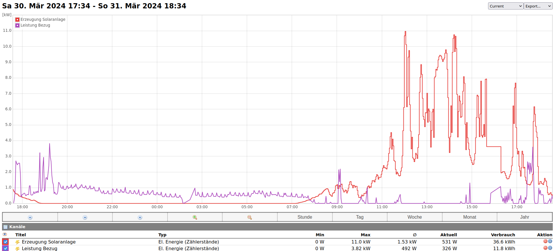 Leider bekomme ich bei den Zählerständen nicht hin, dass mir der Homeassistant sagt, wie viel Strom gerade von der Solaranlage erzeugt wird und wie viel Strom gerade vom Haus gezogen wird. Der Voklszähler zeigt mir die Werte netterweise korrekt an: